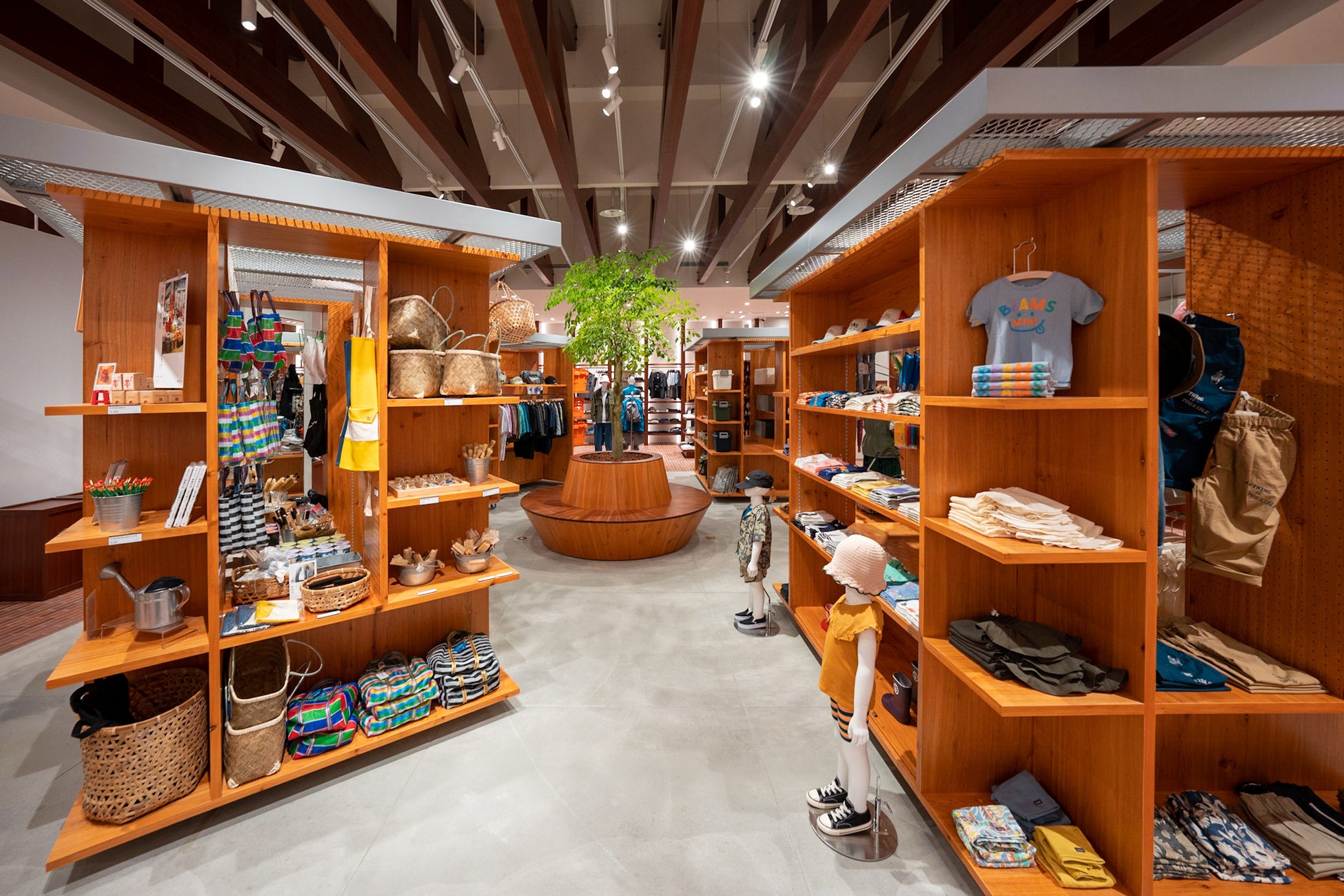 店内は、ファミリーでショッピングを楽しむ市場をイメージしており、店舗中央には、シンボルツリーを囲む円形のベンチを配し、さらにその周囲には屋台に見立てた什器を設置したほか、入り口付近にはイベントスペースも設けています。