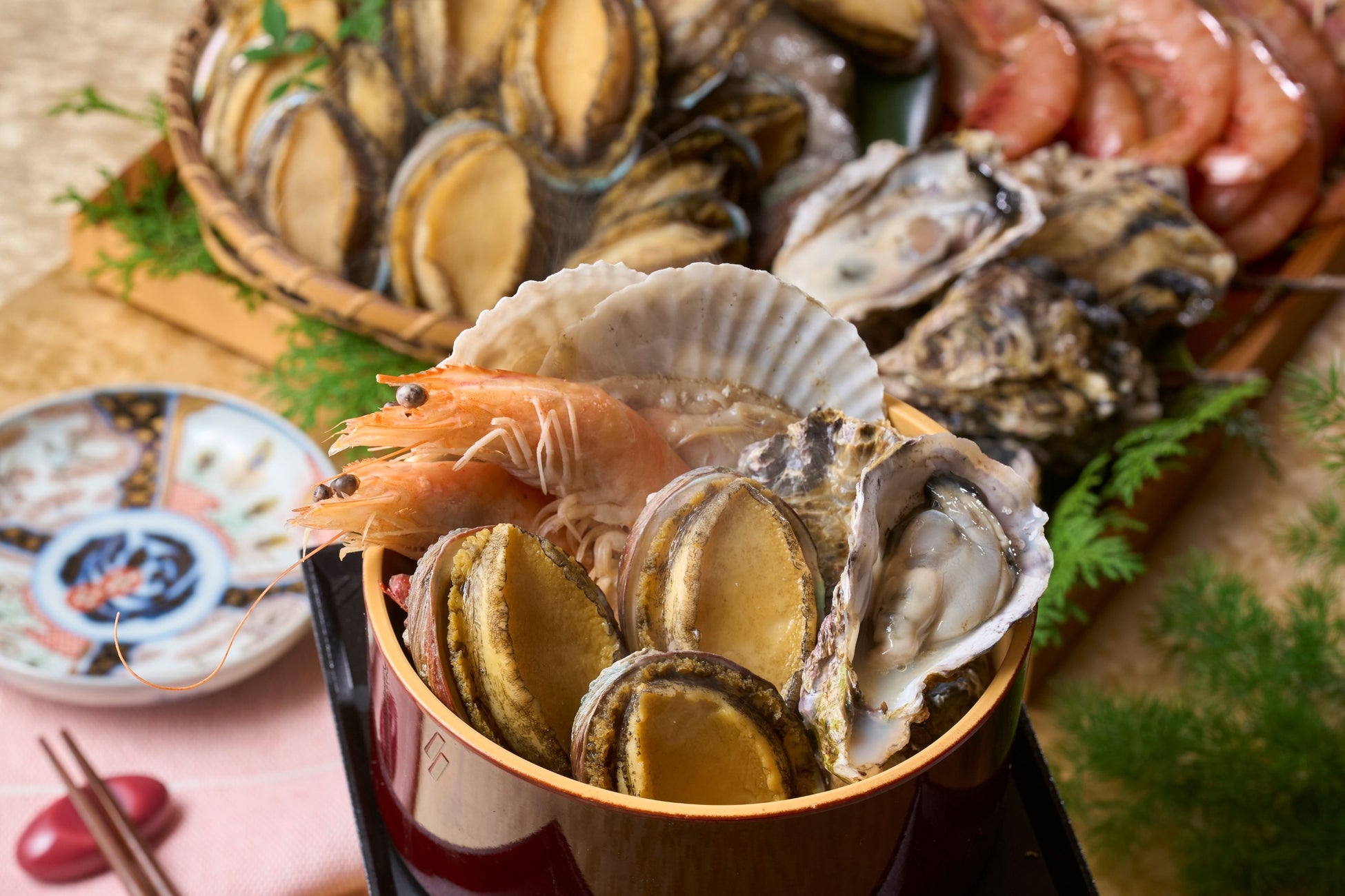 「金目鯛づくしとあわびの海鮮バイキング」をお楽しみいただけます。お造り、握り、煮付けなど、金目鯛を丸ごと味わいつくす贅沢な料理に加え、風味豊かなあわびの海鮮浜蒸しもすべて食べ放題。心ゆくまで海の幸を堪能し、幸せなひと時をお過ごしください。