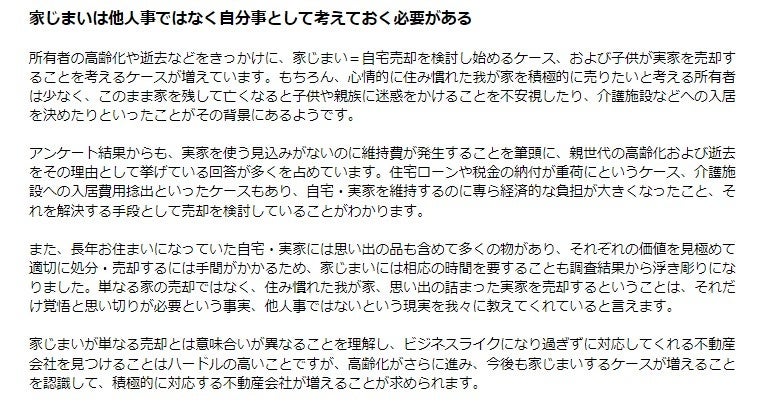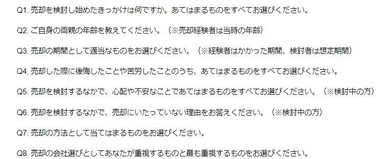 できるだけ高く売りたいという要望がトップに入りその理由としての不動産会社選びが2位というのは順当です。一方で、家じまいでも実家じまいでも必ずついて回るのが家にあるもの、つまり「残置物」の処理です。自分のものでも相続したものでも、価値がありそうで本当は売りたかったけど売却のための手間が面倒であったり、退去まで時間がなく売ることができなかった、という後悔が3位に食い込みました。この「残置物」をどう価値化するかは今後の大相続時代に課題になりそうです。