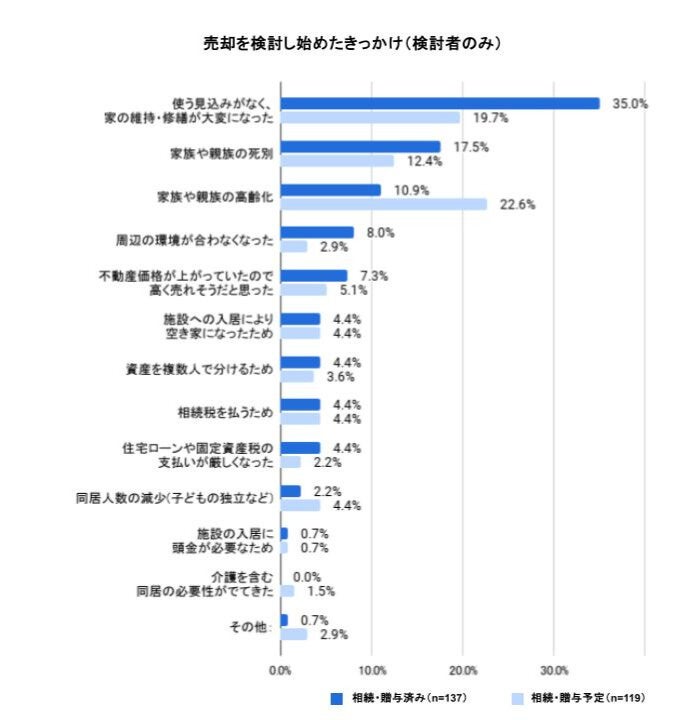 検討者は、売却検討のきっかけにおいて高齢化が死別を上回り2位に