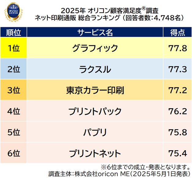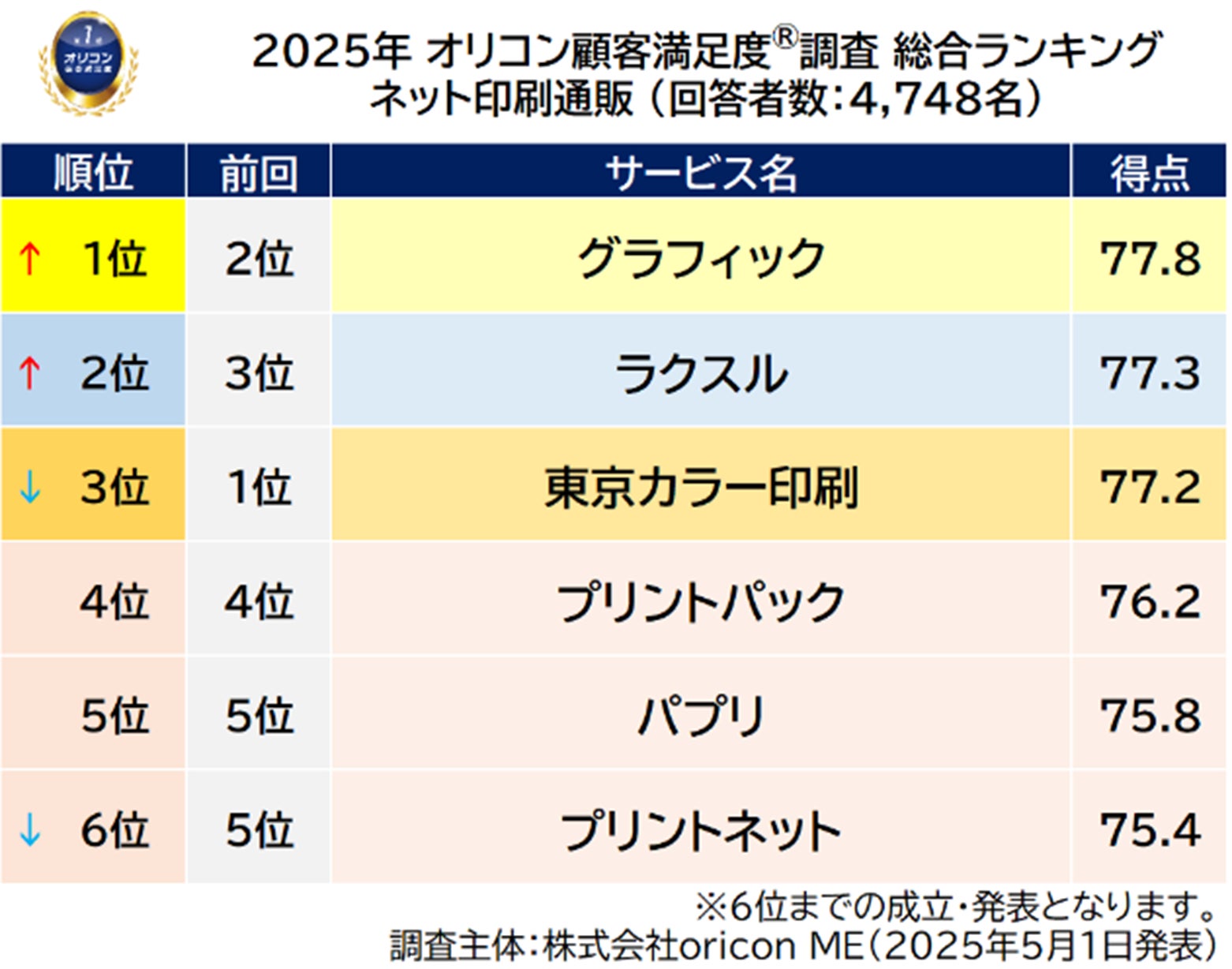 満足度の高い『ネット印刷通販』ランキング【グラフィック】が5年ぶり3度目の総合1位「商品のバリエーション」「注文対応」「品質」の3項目で2年連続1位を獲得(オリコン顧客満足度®調査)