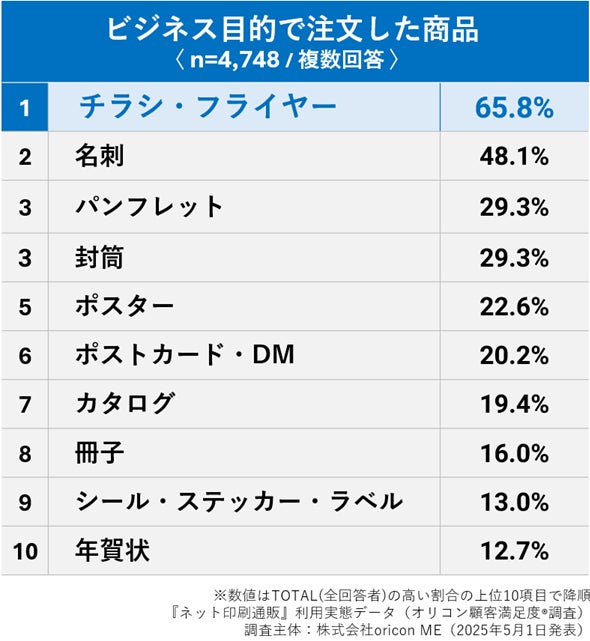 「ビジネス目的で注文した商品はなにか?(複数回答)」について聴取したところ、「チラシ・フライヤー」が65.8%で最多となりました。