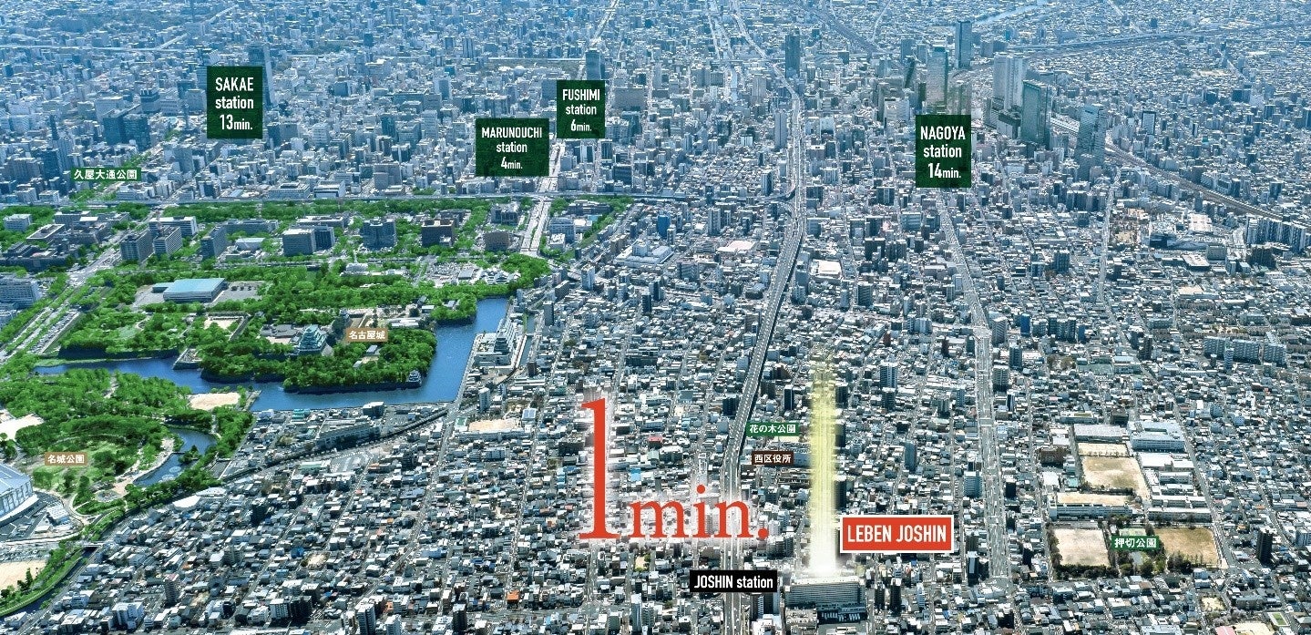※鶴舞線「浄心」駅から:鶴舞線「丸の内」駅直通4分/鶴舞線「伏見」駅直通6分/東山線「栄」駅13分 鶴舞線利用。鶴舞線「伏見」駅で東山線に乗換え。/桜通線「名古屋」駅14分 鶴舞線利用。鶴舞線「丸の内」駅で桜通線に乗換え。掲載の所要時間は通勤時のもので時間帯により異なります。また乗換え・待ち時間を含みます。「名古屋市交通局なごや乗換ナビ」調べ。(2025年4月時点)