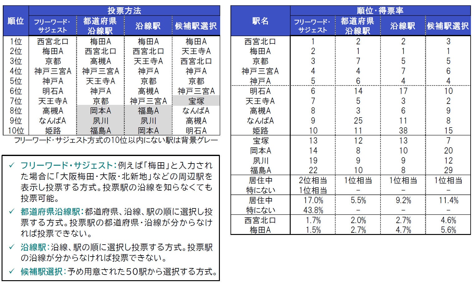 ●一方、明石A・なんば・姫路の代わって、その他の投票方式で上位10位にランクインした岡本A・夙川・福島A・宝塚は(左下の表で背景グレーで表示)、快速や特急の停車駅であったり、中でも福島AはJR大阪環状線や梅田Aに一駅と、沿線駅の中でも本数が多く、交通利便性の高い駅が選ばれているようです。