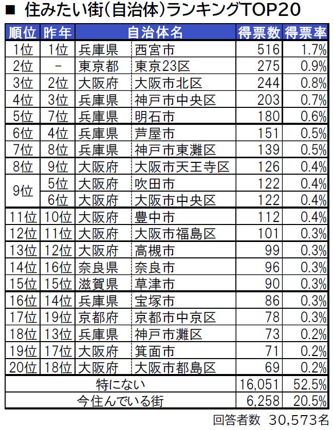 兵庫県西宮市が、4年連続で1位です。昨年は関西(2府4県)の自治体のみを集計対象としていましたが、今年は全国の自治体を対象とした結果、2位に東京23区がランクインしています。3位は大阪市北区で、「街の住みここち(自治体)ランキング<関西版>」では5位となっています。上位20位までの自治体は、順位変動はあるものの、2位の東京23区以外は昨年と同じ顔ぶれで大きな変動はありません。