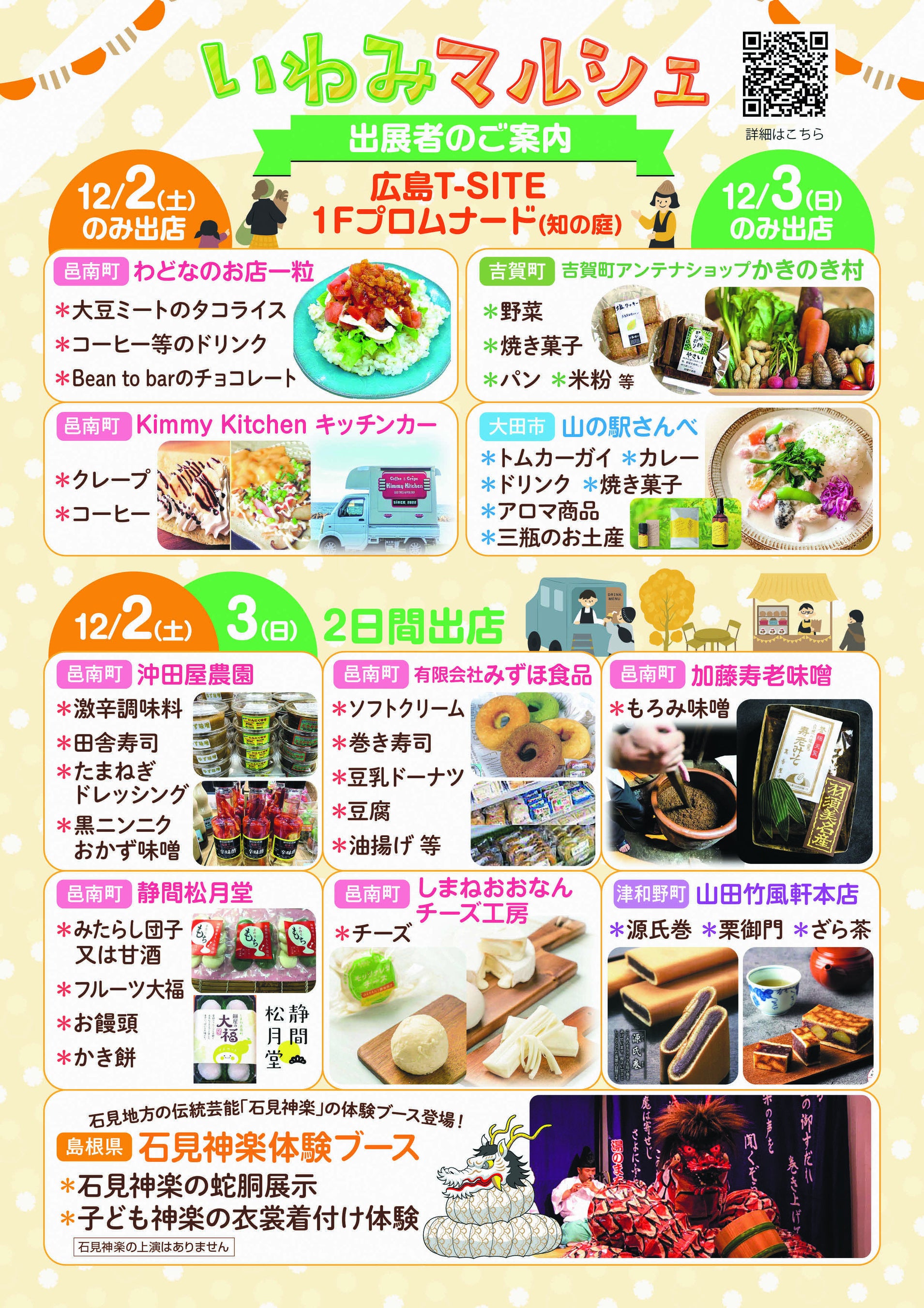石見のおいしいものが集まるマルシェを開催!有機野菜、無添加の加工食品、郷土の銘菓などこだわりの逸品をお届けします。12月2日~3日には石見神楽の子ども衣裳着付け体験も行います。
