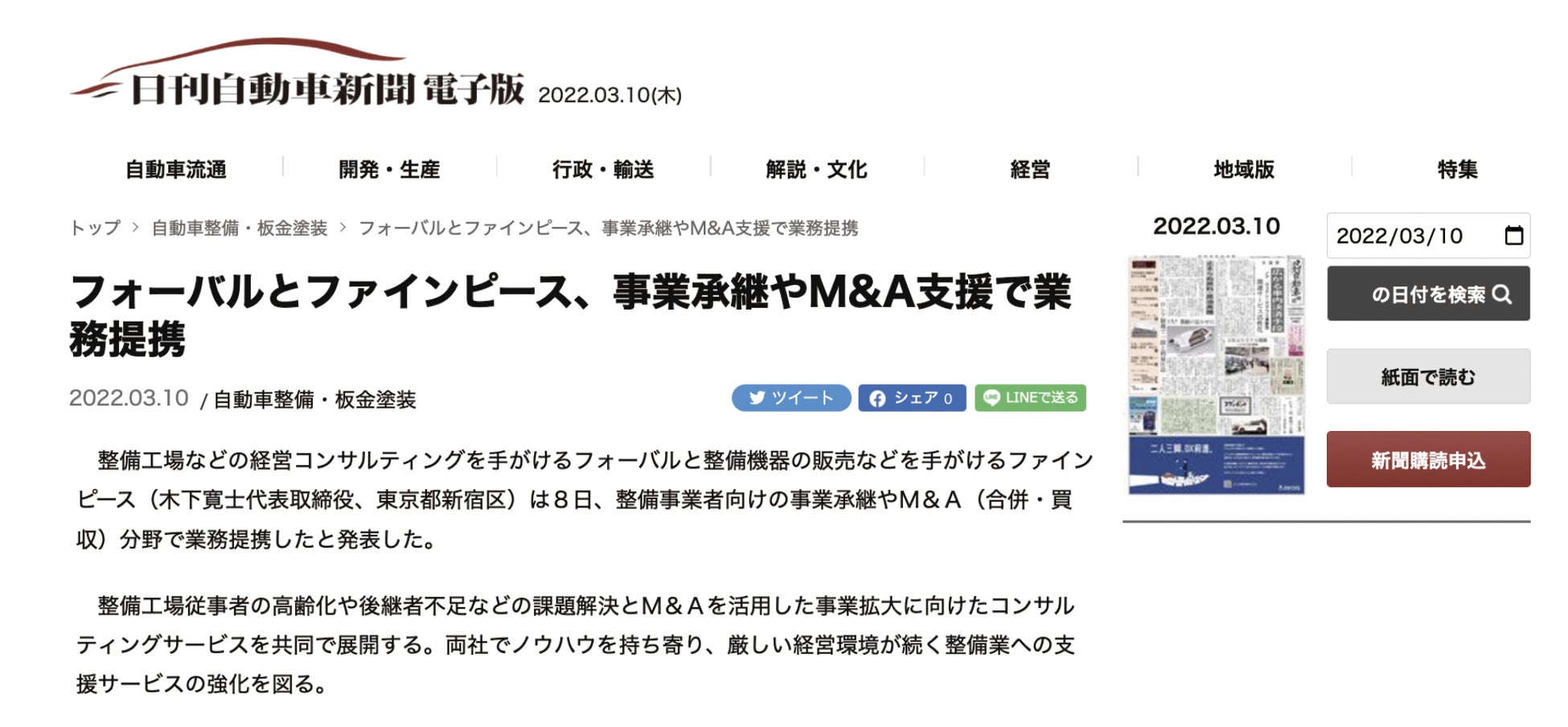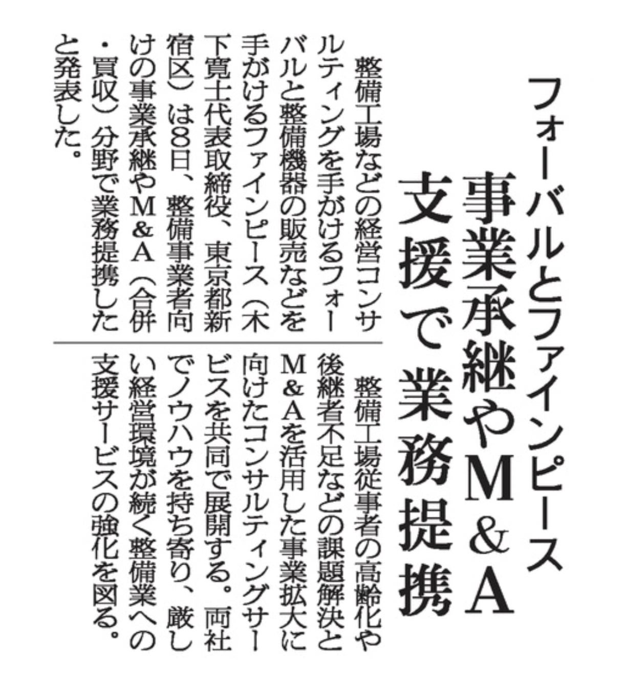 ファインピース、M&A・事業承継事業においてフォーバルと業務提携を発表。自動車整備工場の高齢化や後継者不足の課題に対応すると共に、M&Aによる事業拡大のコンサルサポートも展開する方針。