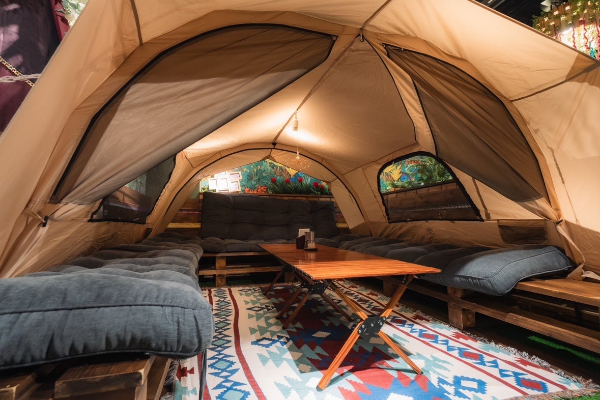 テーブル席をテント付きの完全個室へと改装し、屋内にいながら自然を感じられる特別なひとときを提供。栄という都市の中心にありながら、まるでアウトドアリゾートにいるかの様な空間です。