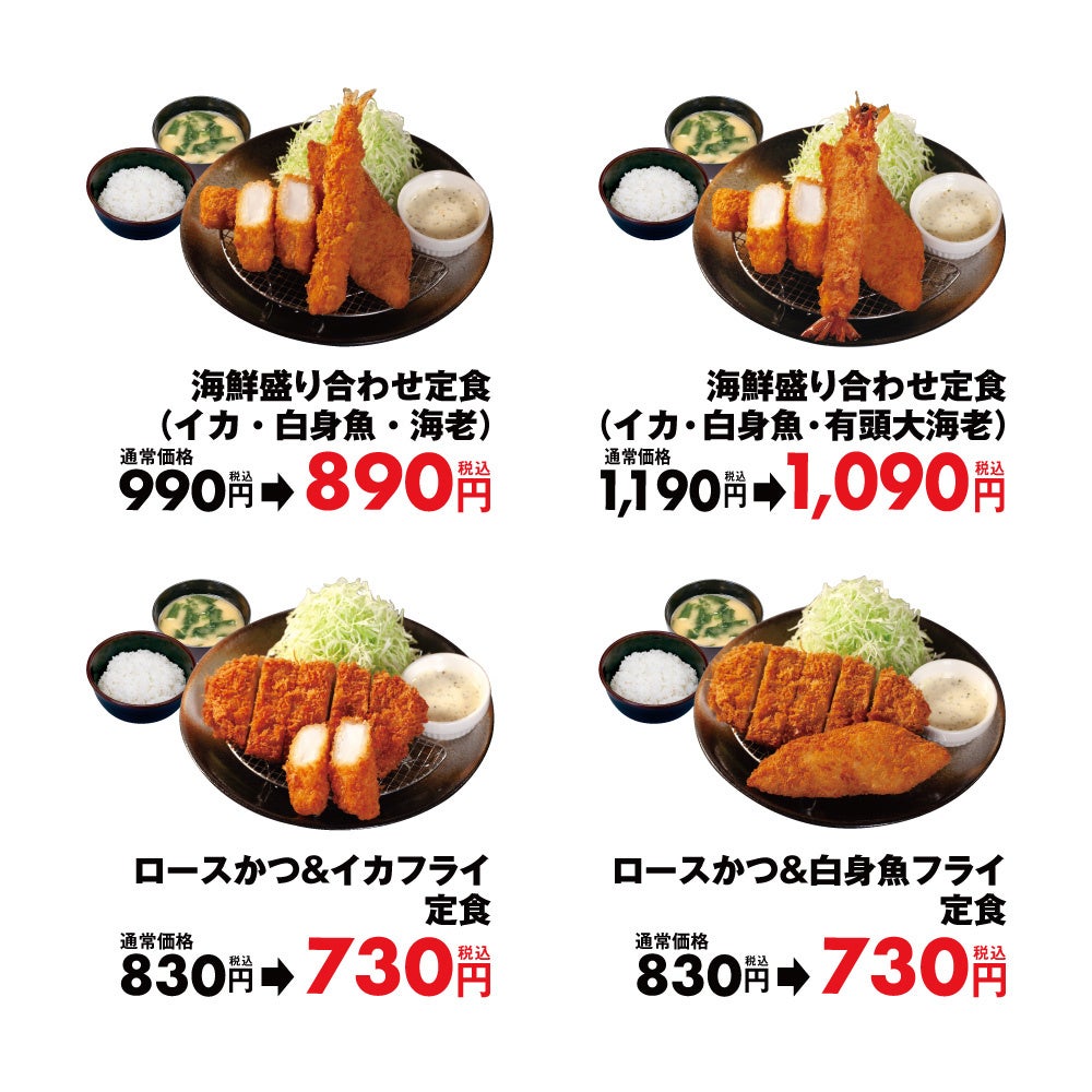 商品名 海鮮盛合せ定食(イカ・白身魚・海老) 990円 → 890円 海鮮盛合せ定食(イカ・白身魚・有頭大海老) 1,190円 → 1,090円 ロースかつ&イカフライ定食 830円 → 730円 ロースかつ&白身魚フライ定食 830円 → 730円 ※お持ち帰りいただけます。お持ち帰りのみそ汁は、別途60円でお買い求めいただけます。 ※全て税込価格です。また、店内・お持ち帰りの税込価格は同一です。 ※株主優待券は上記全てのメニューにご使用いただけます。
