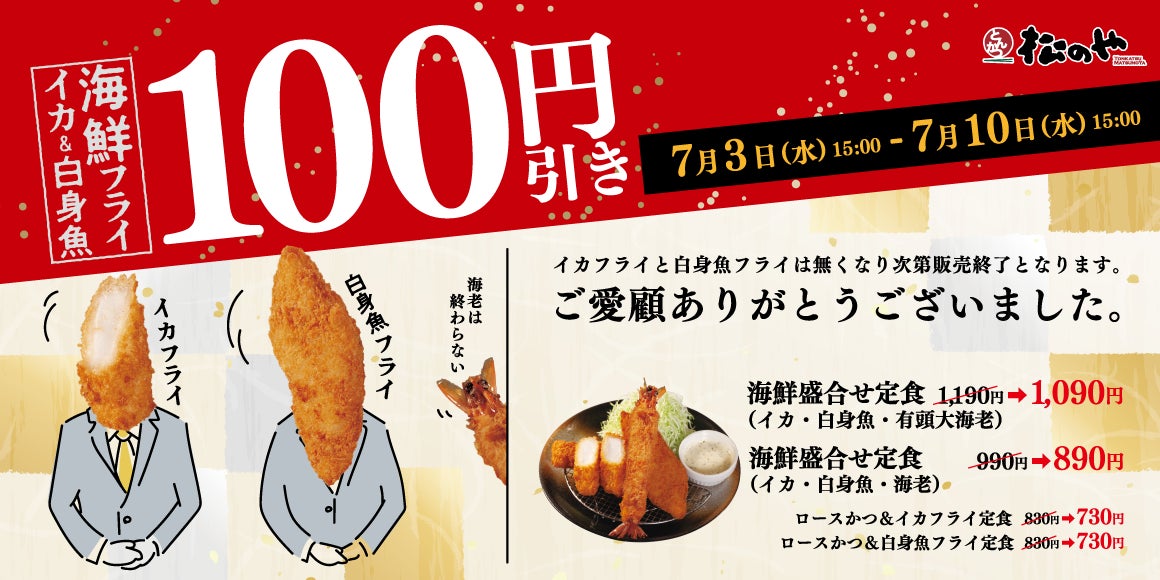 松のやの海鮮フライ、噛めば噛むほどにイカの旨味がたっぷり感じられる「イカフライ」、衣サクッと、身はふわっと「白身魚フライ」が今季はこれにて販売終了いたします。販売終了に伴い、ご愛顧への感謝の気持ちを込めて、松のや自慢の「海老フライ」も合わせて楽しめる豪華海鮮トリオ「海鮮盛合せ定食」を100円引きにて販売いたします。「ロースかつ&イカフライ」「ロースかつ&白身魚フライ」の盛合わせ定食も値引き対象商品です。「海鮮フライ盛合せ定食100円引きSALE」は2024年7月10日(水)まで。以降、イカフライ・白身魚フライは商品無くなり次第終了となります。サクッとやわらか、ヘルシーな海鮮3種の盛合せ、海鮮フライの食べ納めにいかがでしょうか。