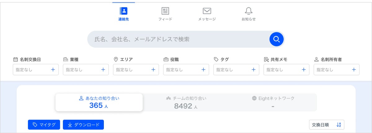 ホーム画面をこれまでの「フィード」から「連絡先」に刷新しました。「連絡先」画面の横幅を広げることで、表示される名刺の情報量を増やしています。また業種やエリアでの絞り込み検索をワンクリックで簡単に操作できるように設定し、新たに「名刺交換日」で名刺情報を絞り込める機能を追加しました。検索で絞り込んだ名刺情報に一括でタグを付与したり、CSVファイルでダウンロードすることも可能です(※3)。