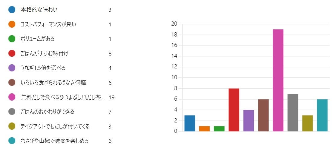最も多くの票を集めたのは『無料だしで食べるひつまぶし風だし茶漬け』というポイントでした。2位は『ごはんがすすむ味付け』、3位は『ごはんのおかわりができる』でした。
