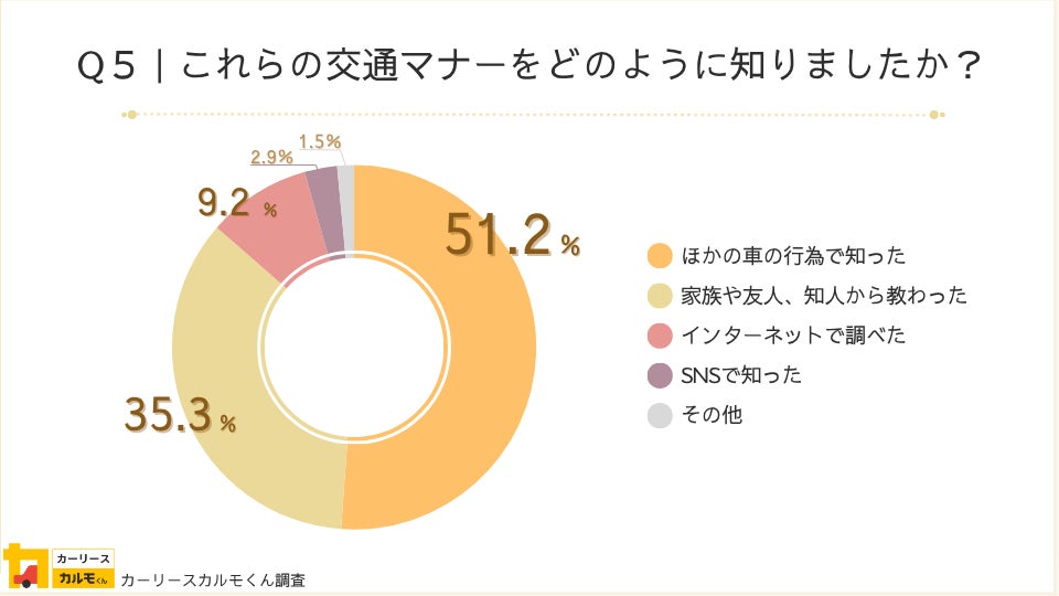 暗黙のルールと呼ばれる交通マナーはどのように認知されていくのか、運転する機会がある全国の男女2,240人に知ったきっかけについても聞いたところ、半数以上となる51.2%が「ほかの車の行為で知った」と回答しました。