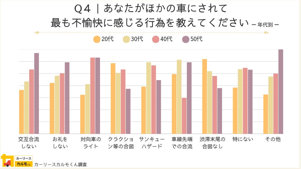 なお、不愉快に感じる行為を年代別に見ると、50代では「1台ずつの交互合流をしない」や「お礼の行為がない」の割合がほかの年代に比べ特に高く、マナーの基準が明確で、重んじる意識がより強いことがわかります。