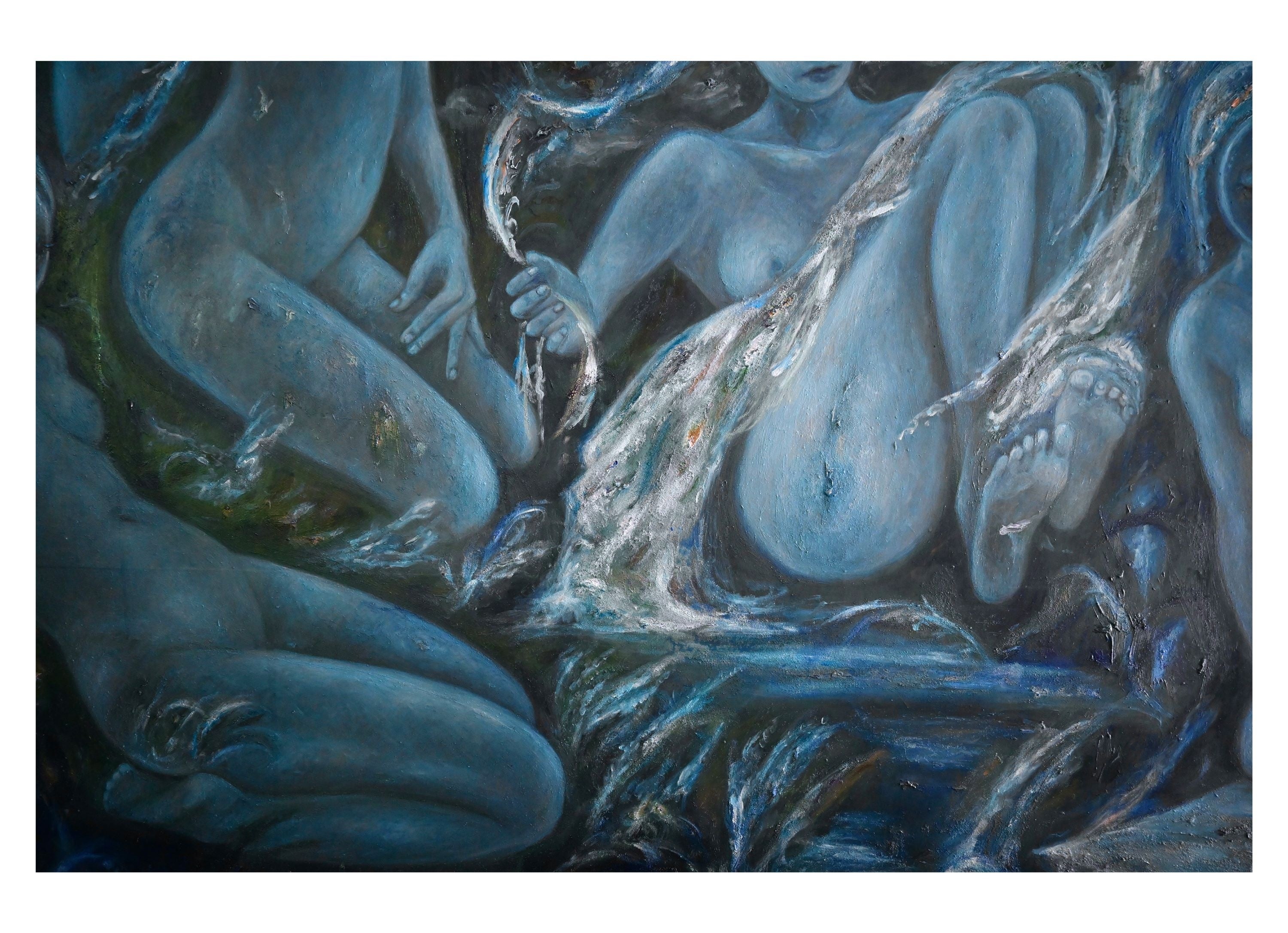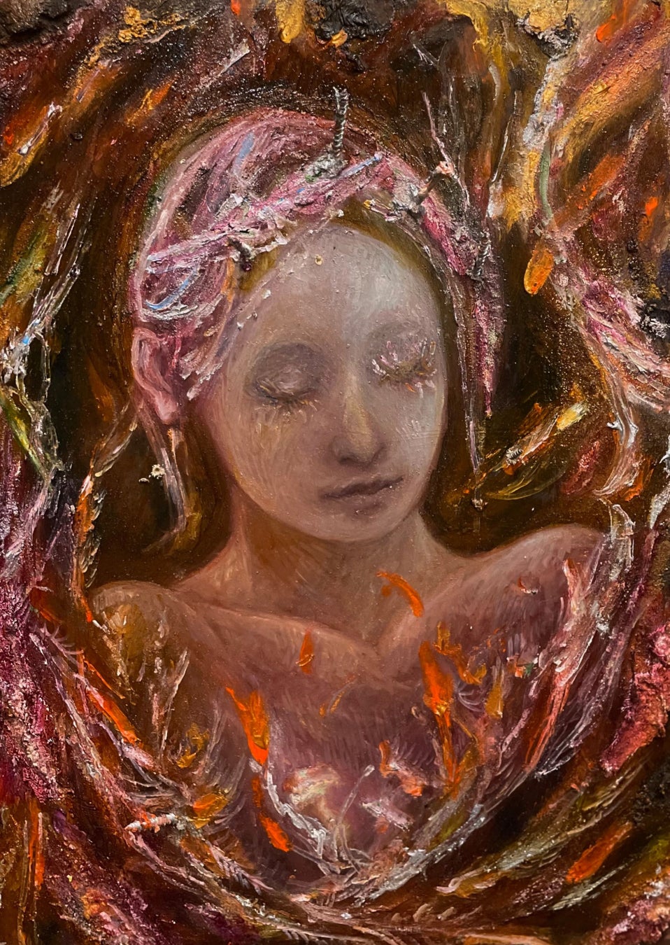 描かれる女性像は、天と人、絵画と現実世界との接点にいる狭間の者たちで、私たちの依り代、あるいは身代わりとなっていく存在です。