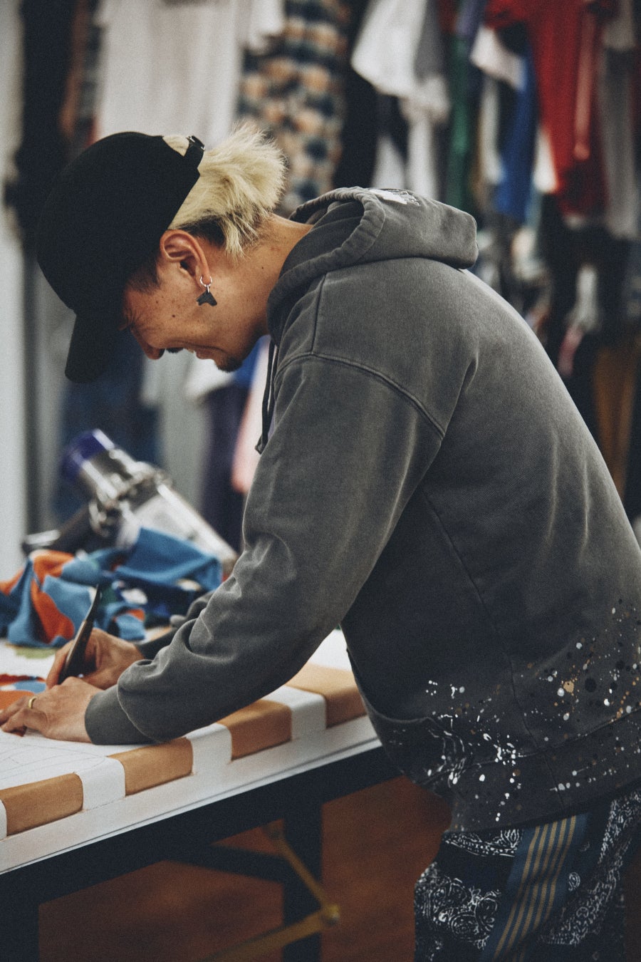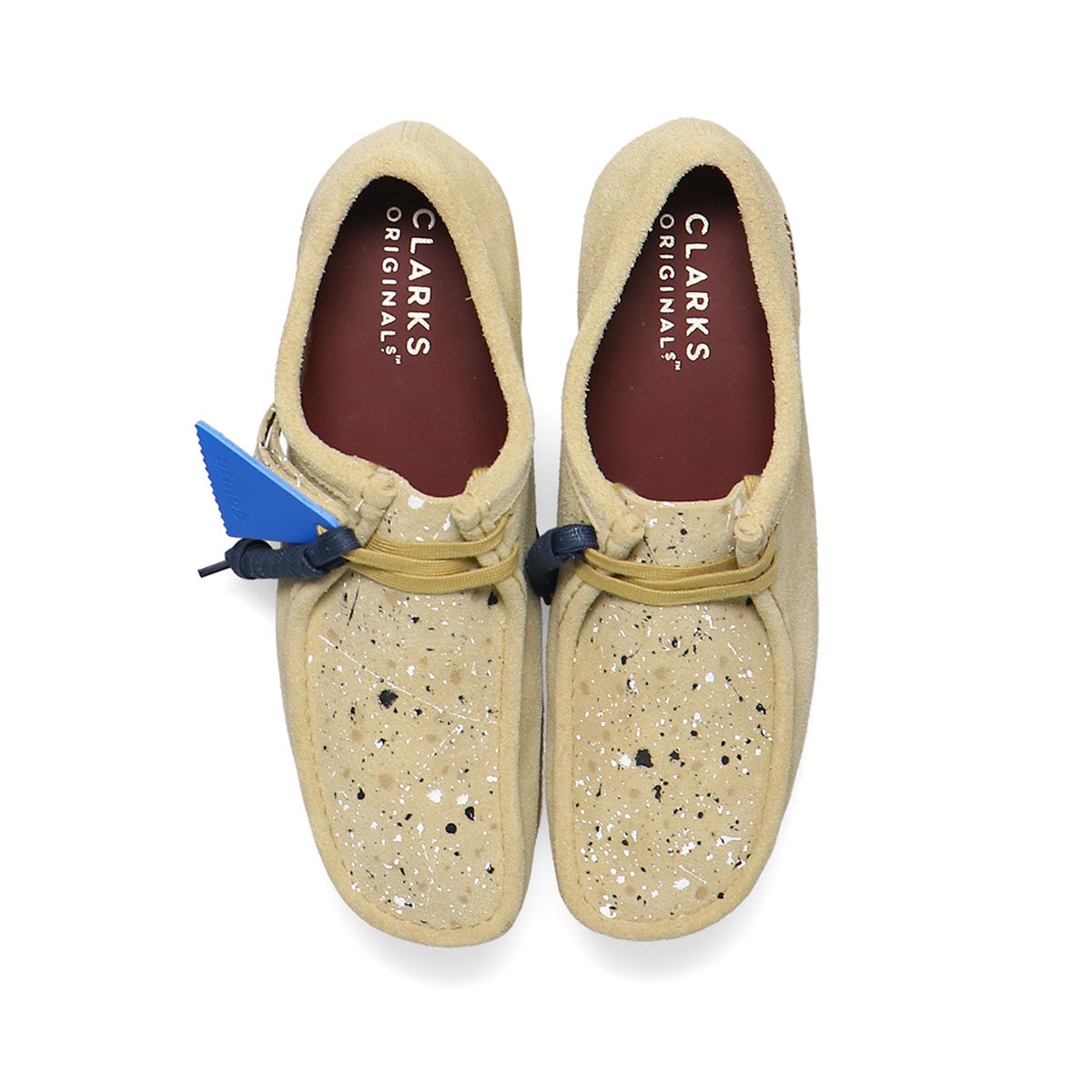 そんなWALLABEEに日本のクラフトマンシップのフィロソフィーを注ぎ込んだ今作は、職人が一点、一点手作業でドリッピングした同じ柄がひとつとしてない渾身のアートワークを詰め込んだプレミアムな仕様でデザイン。ベースは定番のベージュカラーにスウェードというあえての王道スタイルを貫いて、ヒール部には、「WIND AND SEA」のロゴをレーザー加工で刻印。さらに、「Clarks Originals」のレザータグの他、「atmos」ロゴが入ったブルーのレザータグも付属。伝統と歴史を紡ぐオーセンティックなシューズに日本のスピリットを交えた一足が登場します。