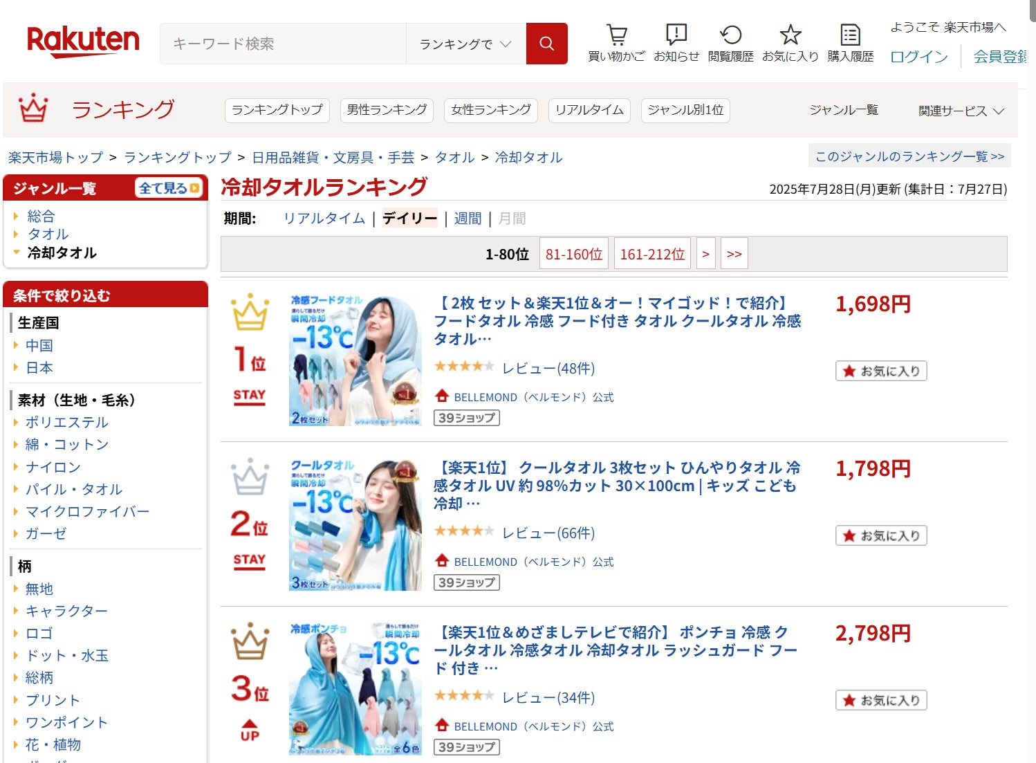 この度、Fun Standard株式会社(本社:福岡県大野城市/株式会社RKB毎日ホールディングス グループ/代表取締役:大屋 良介、笹森 広貴)が展開するブランド「BELLEMOND(ベルモンド)」の人気商品「ふりふり冷感タオルシリーズ」3商品が、楽天の冷却タオルデイリーランキングで1位、2位、3位を獲得したことをお知らせいたします。(2025年7月28日現在)