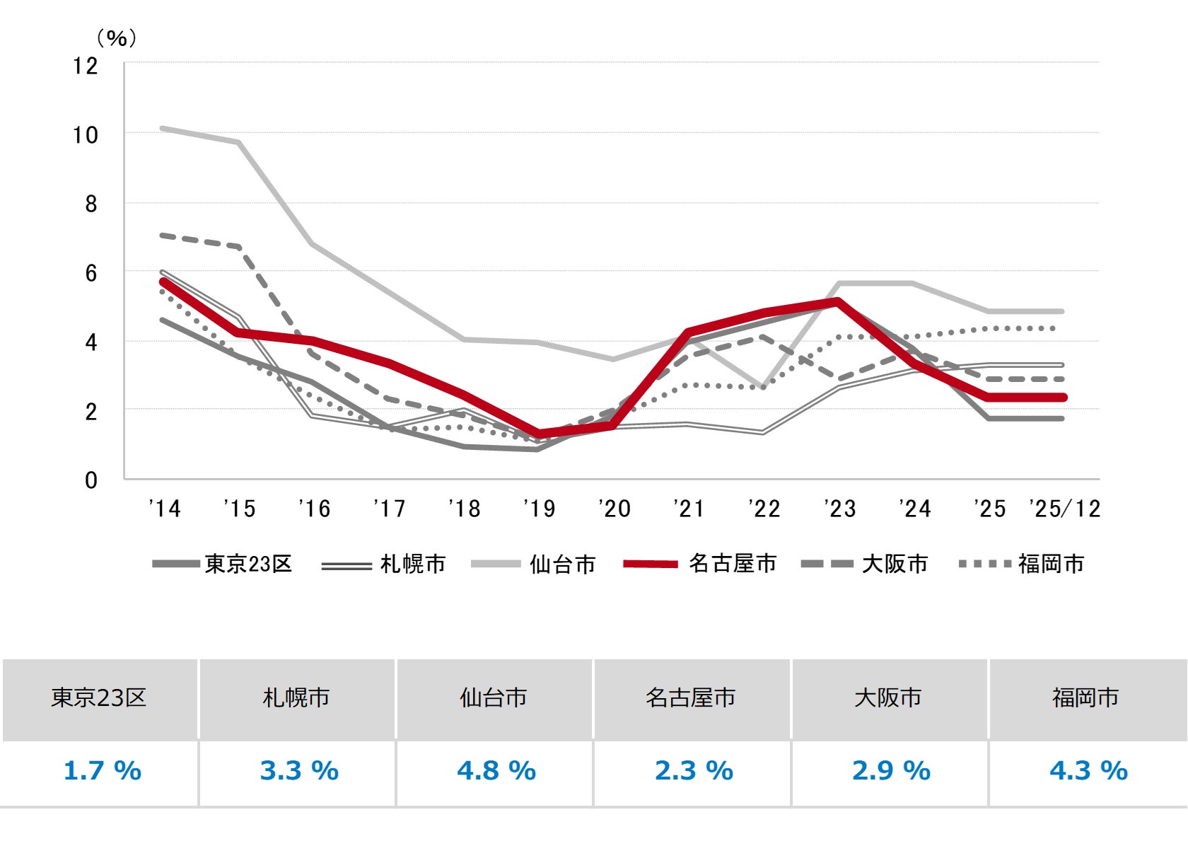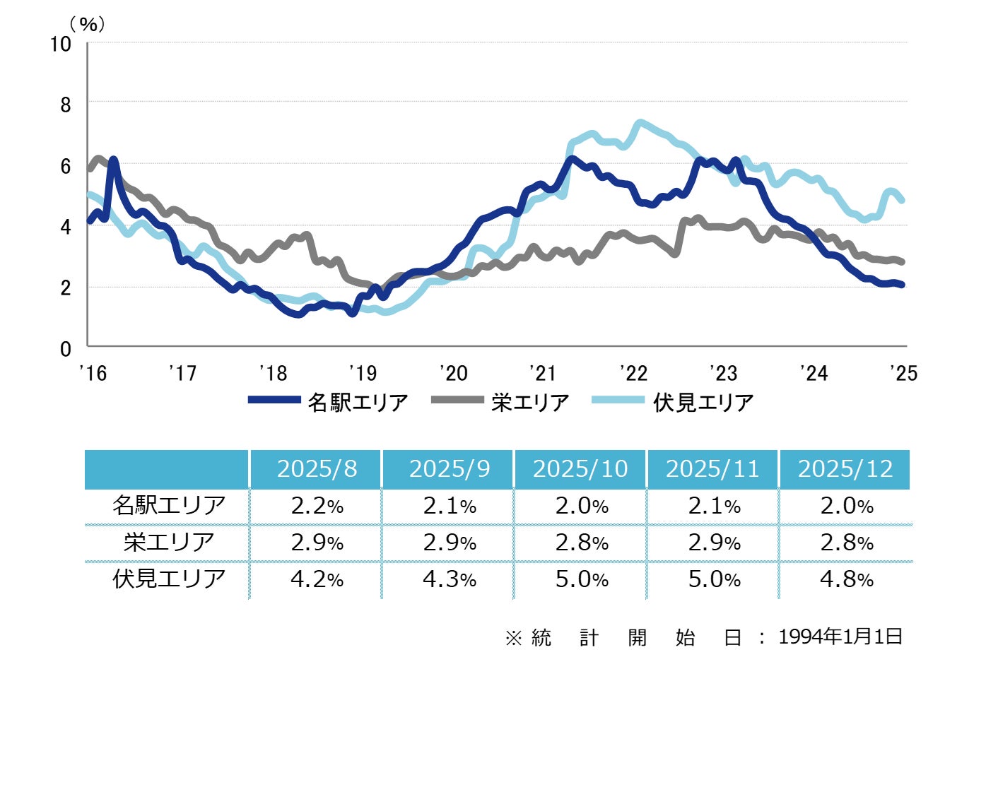 2025年は約6千坪と比較的低水準の供給量に止まったが、2026年は栄エリアを中心に約3万坪の大量供給が予定されている。多くのビルでテナント誘致が進み既に高い内定率にあることから、新規供給により需給バランスが大きく緩むことはないとみられる。また、今年の新築ビルに移転するテナントによる二次空室は足元では限定的な水準に止まっており、今後の動向が注目される。(名古屋支店長 妹尾哲也)
