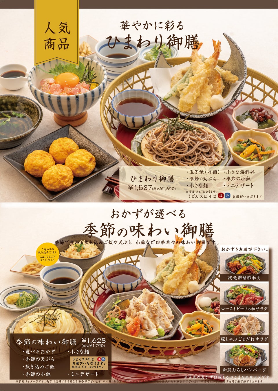 九州産のかつおと北海道産の昆布で丁寧にひいた、当店の”特製お出汁”をたっぷり使用した名物玉子焼と揚げたての天ぷらがついた天ぷらうどん、季節の炊き込みご飯が付いたひまわりのお出汁を存分に味わっていただけるメニューです。