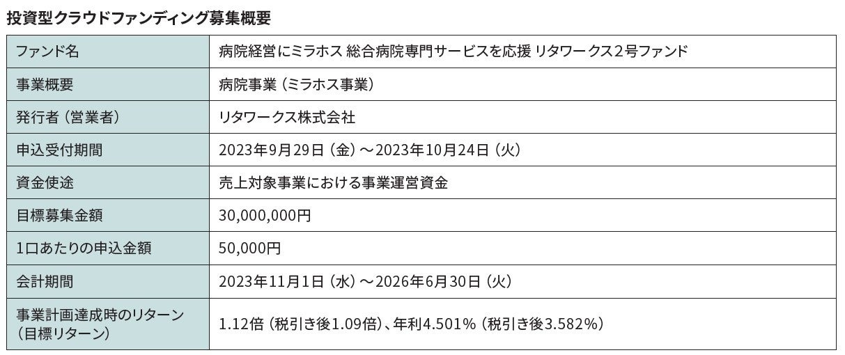大阪市に本社を置く同社は、社名にも込められた「利他の想いと行動で、世界をより良くする」を企業理念に、全国の総合病院向けホームページ制作・運用サービス「ミラホス」と、NPO(非営利組織)専門のホームページ制作・運用サービス「ニューウェブ」の2事業を柱に成長を続けています。2号ファンドの売上対象となる「病院事業(ミラホス事業)」は、より良い医療情報の提供、地域コミュニティの発展への貢献に加え、病院に特化した取り組みにより蓄積したノウハウを生かし、多くの病院が抱える課題の解決法提案やさまざまなニーズに応えることで、医療サービスの向上に寄与しています。