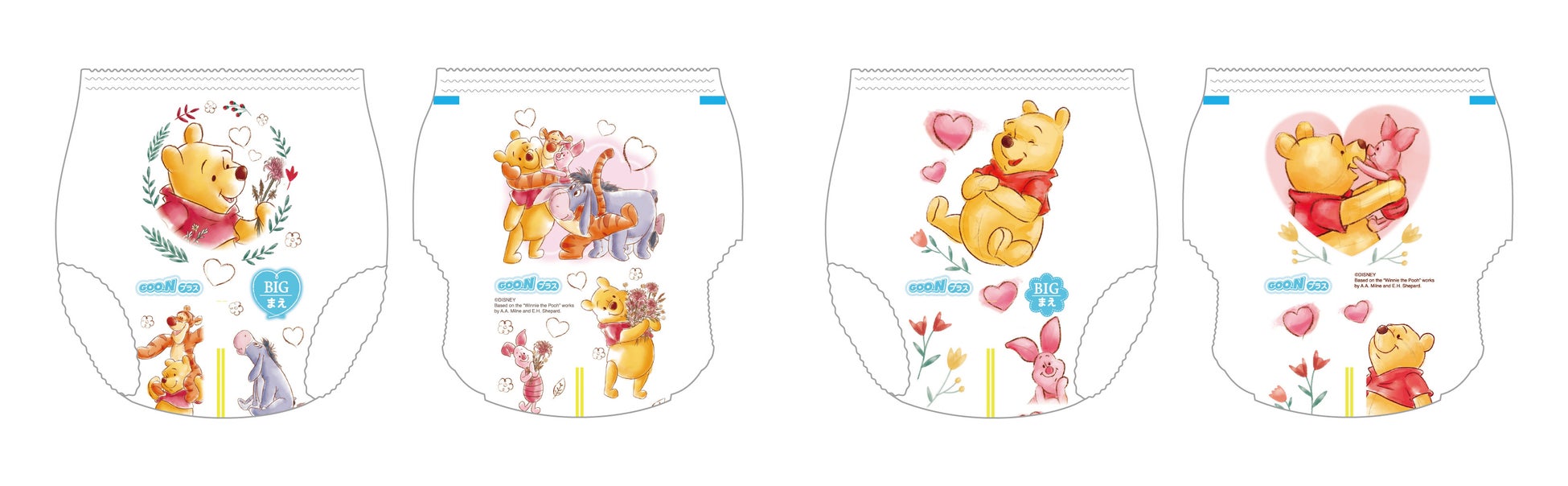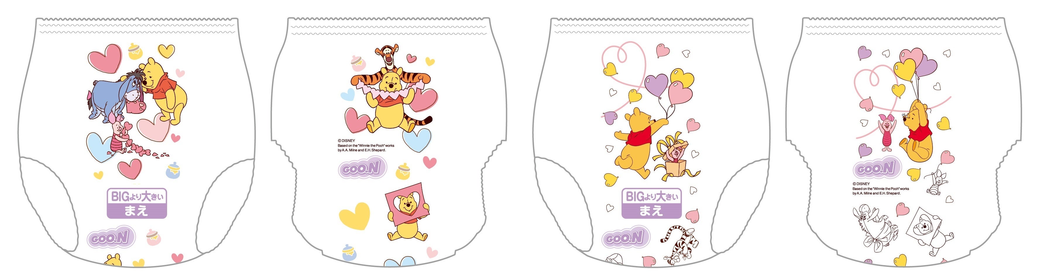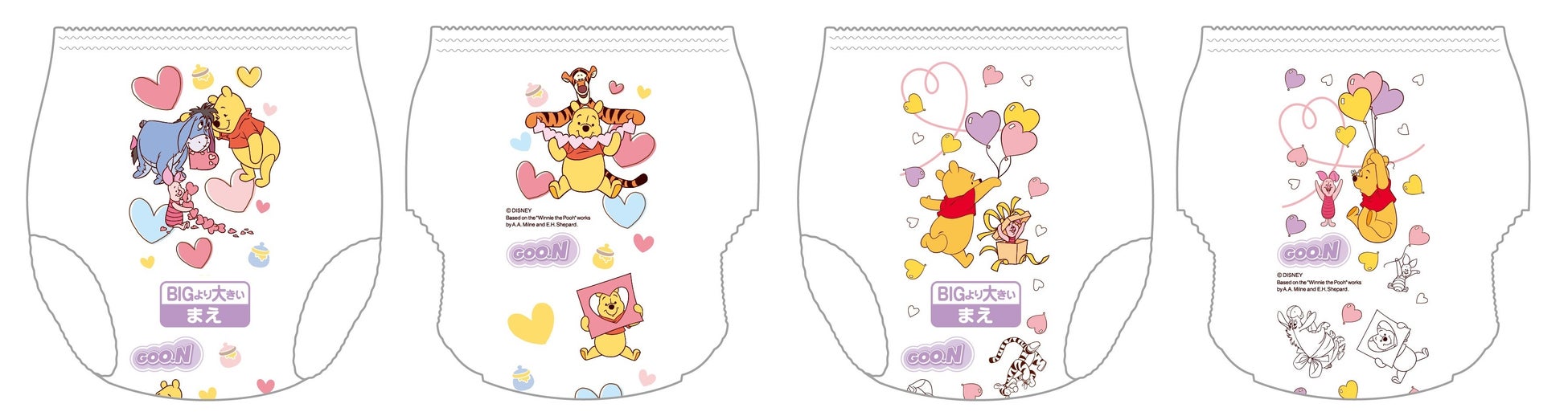 3年目となる今年は、プーさんの世界観をさらにお楽しみいただけるよう、従来の「グーン ぐんぐん吸収パンツ」に加えて、「グーンプラス 肌快適設計 パンツ」もラインナップに仲間入りし、2シリーズ全7商品にスケールアップ。ハート柄をモチーフにしたプーさんのかわいいパッケージとおむつ柄の新デザインで、毎日のおむつ替えに“癒し・楽しさ”をお届けします。