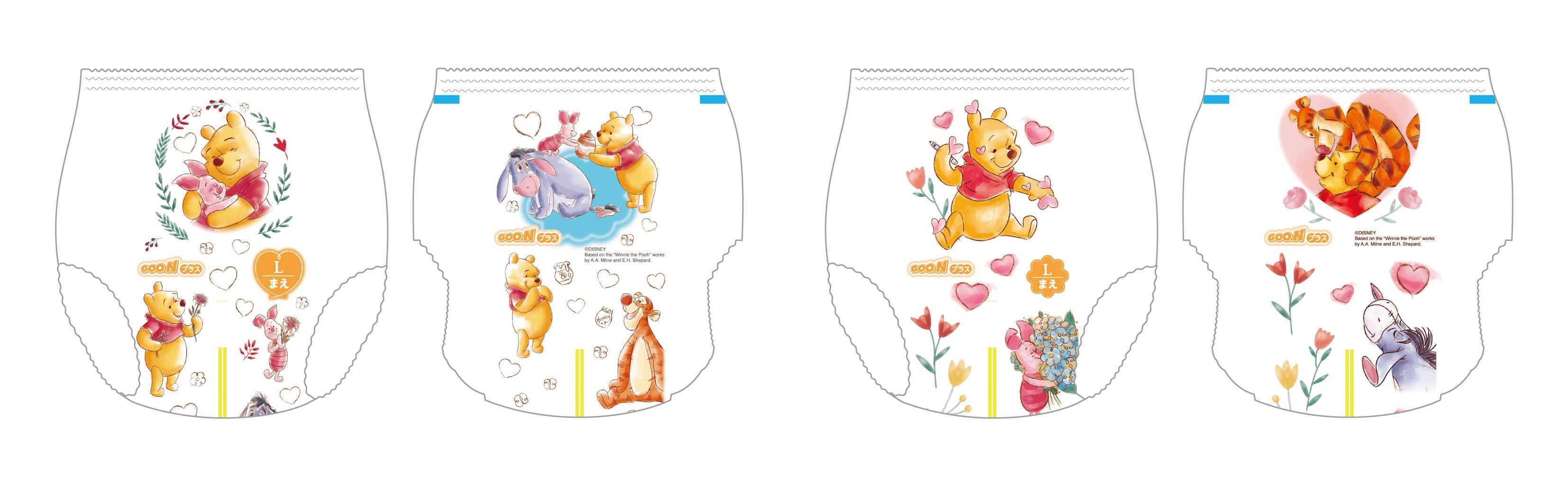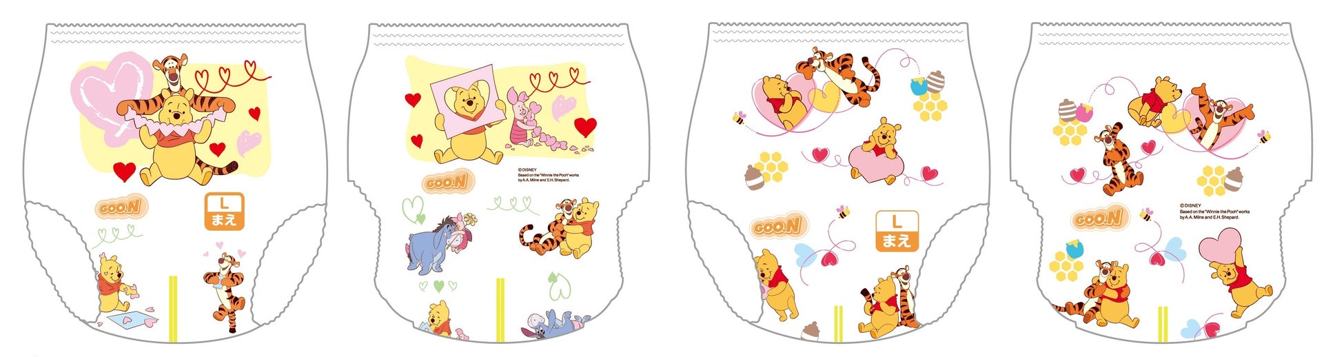 おむつ柄は各サイズ2種(全14種)を揃えており、プーさんと森の仲間のピグレット、ティガー、イーヨーが仲良く遊ぶ姿に思わず顔がほころんでしまうようなデザインに仕上げました。