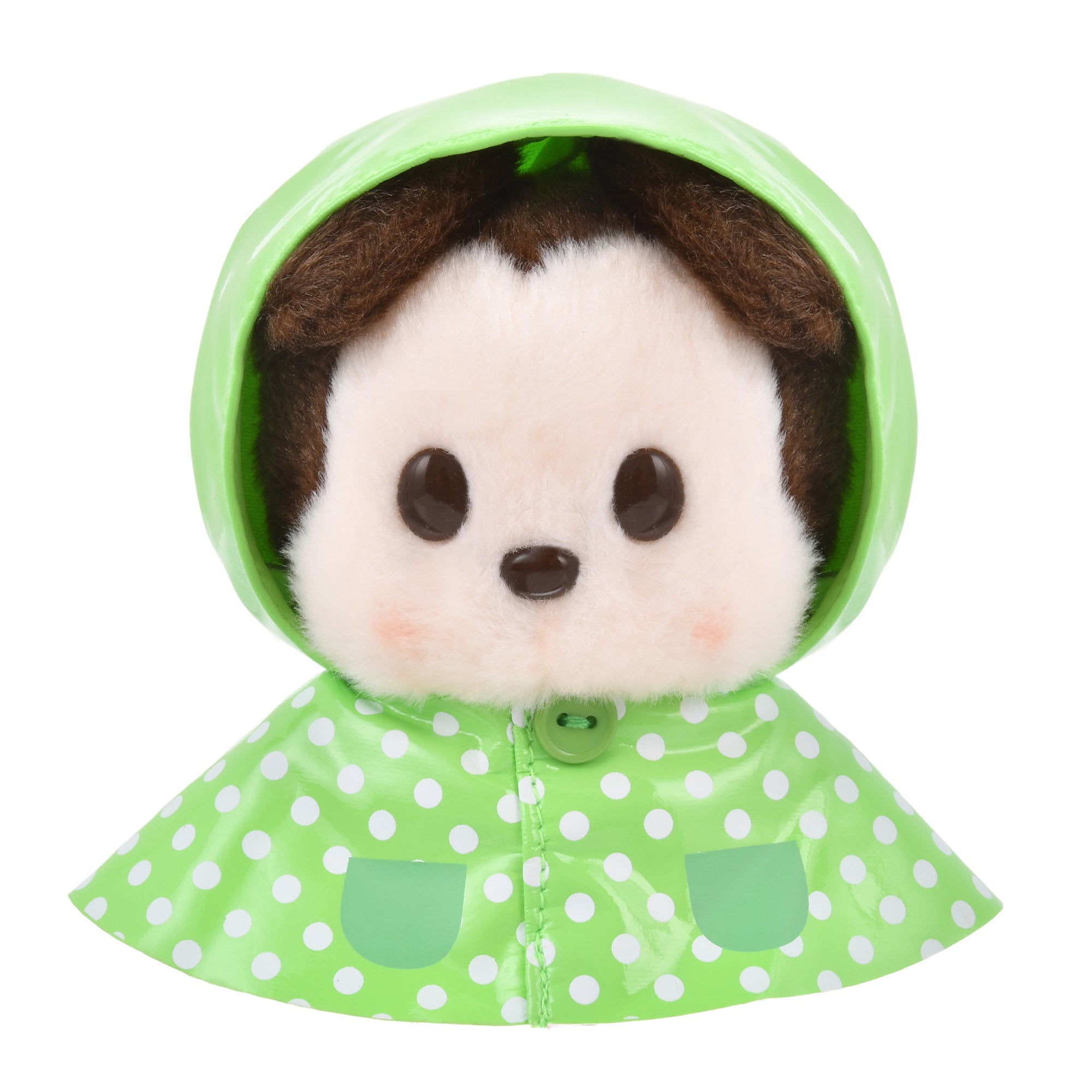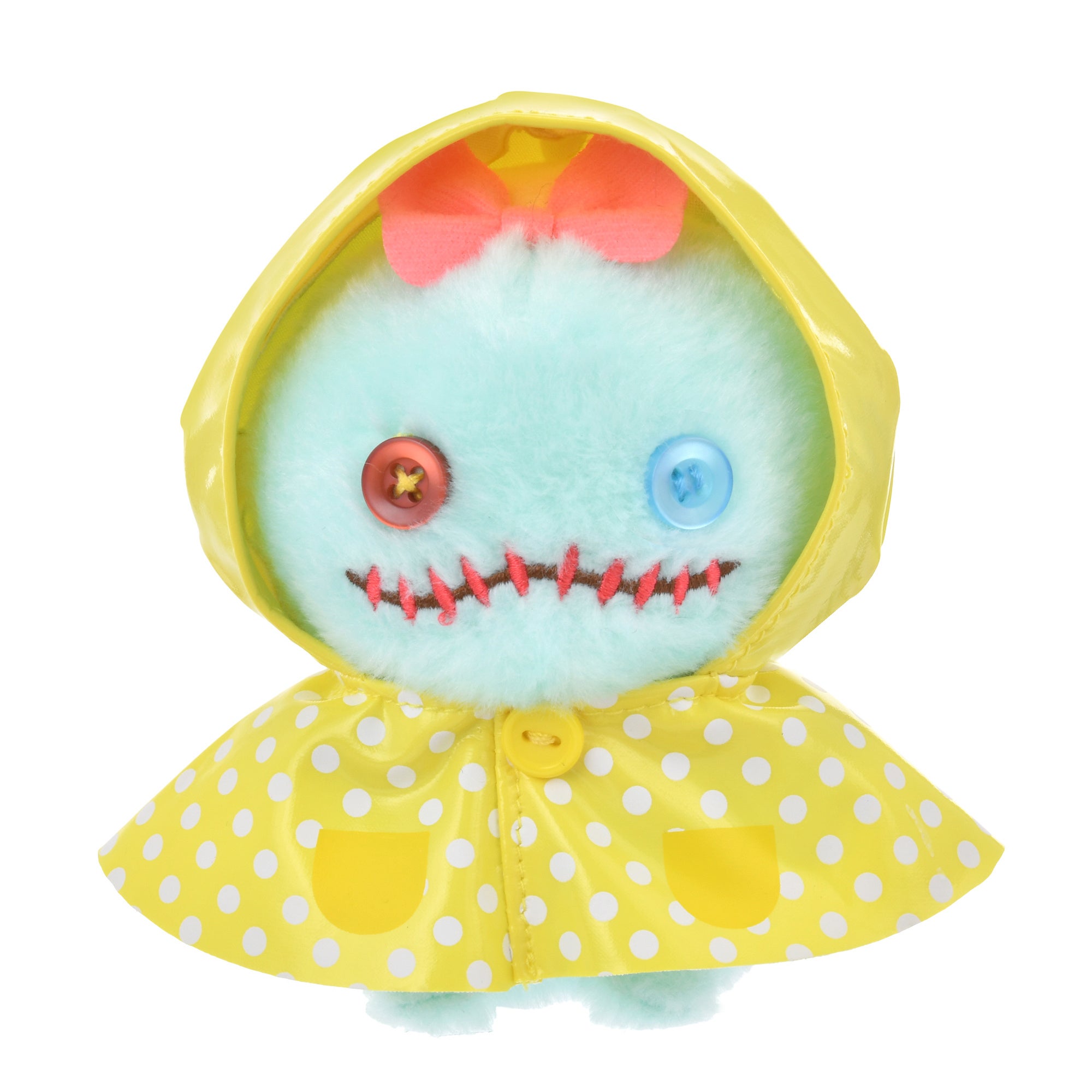 「うるぽちゃちゃん」からは、レインポンチョを着たぬいぐるみが登場します。ツヤツヤとした素材のレインポンチョは、キャラクターに合わせたカラフルなカラーでドット柄がポイントのキュートなデザインです。フードをかぶせたり、脱がせたりすることで、2通りのかわいさを楽しむことができます。お部屋に飾るだけでなく、雨の日に一緒におでかけするのにもぴったりです。