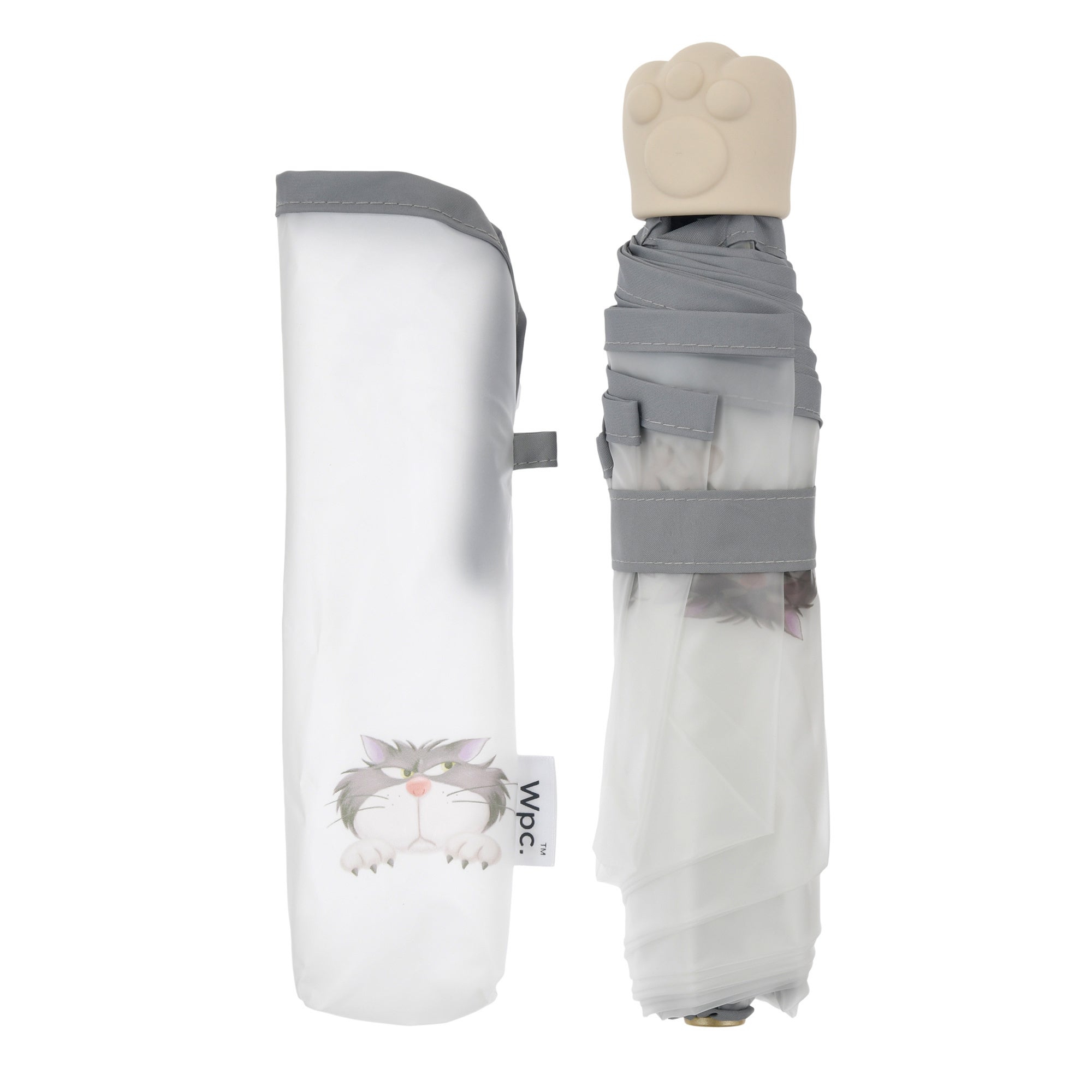 「Wpc.」との共同企画商品の折りたたみ傘は、傘生地部分がビニールで、ちょっぴりふてくされたような表情がキュートなルシファーのフェイスアートがポイントです。さらに、ハンドルが肉球モチーフで、シンプルながら遊び心あふれるデザインです。