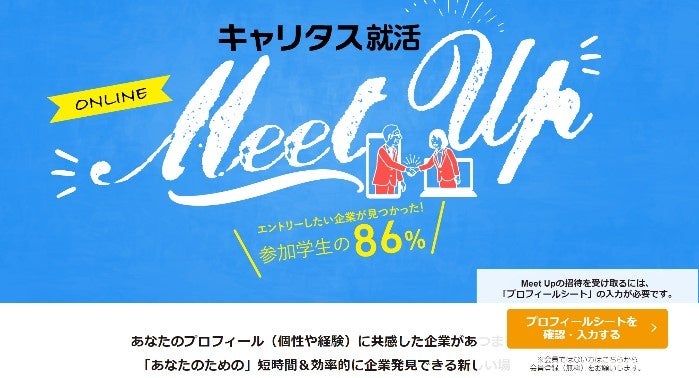 あなたのプロフィール内容(個性や経験など)に共感した企業があつまる招待型オンラインイベントです。Meet Upの招待を受け取るためには、キャリタス就活2024内の「プロフィールシート」の入力が必要です。