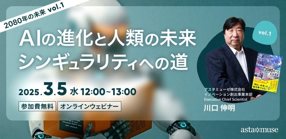 アスタミューゼ株式会社(本社:東京都千代田区、代表取締役社長 永井歩)は、2025年3月5日(水)12:00-13:00に、『2060 未来創造の白地図』および『2080年への未来地図』著者、弊社のExecutive Chief Scientistである川口伸明による無料ウェビナー「AIの進化と人類の未来:シンギュラリティへの道 ~2080年の未来シリーズvol.1~」を再開催いたします。書籍に取り上げた技術領域や社会課題、未来世界について語るウェビナーです。