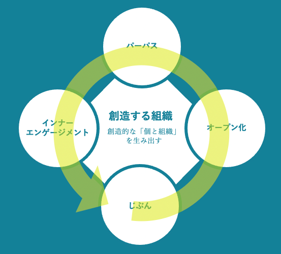 この「創造する組織」による企業の変革は、じぶんを起点として社会と結びつきながら組織との関係を捉え直していくことで、最終的に、個人と組織とが、co-well-beingを果たし、また社会へのポジティブな貢献を果たしていくことができます。