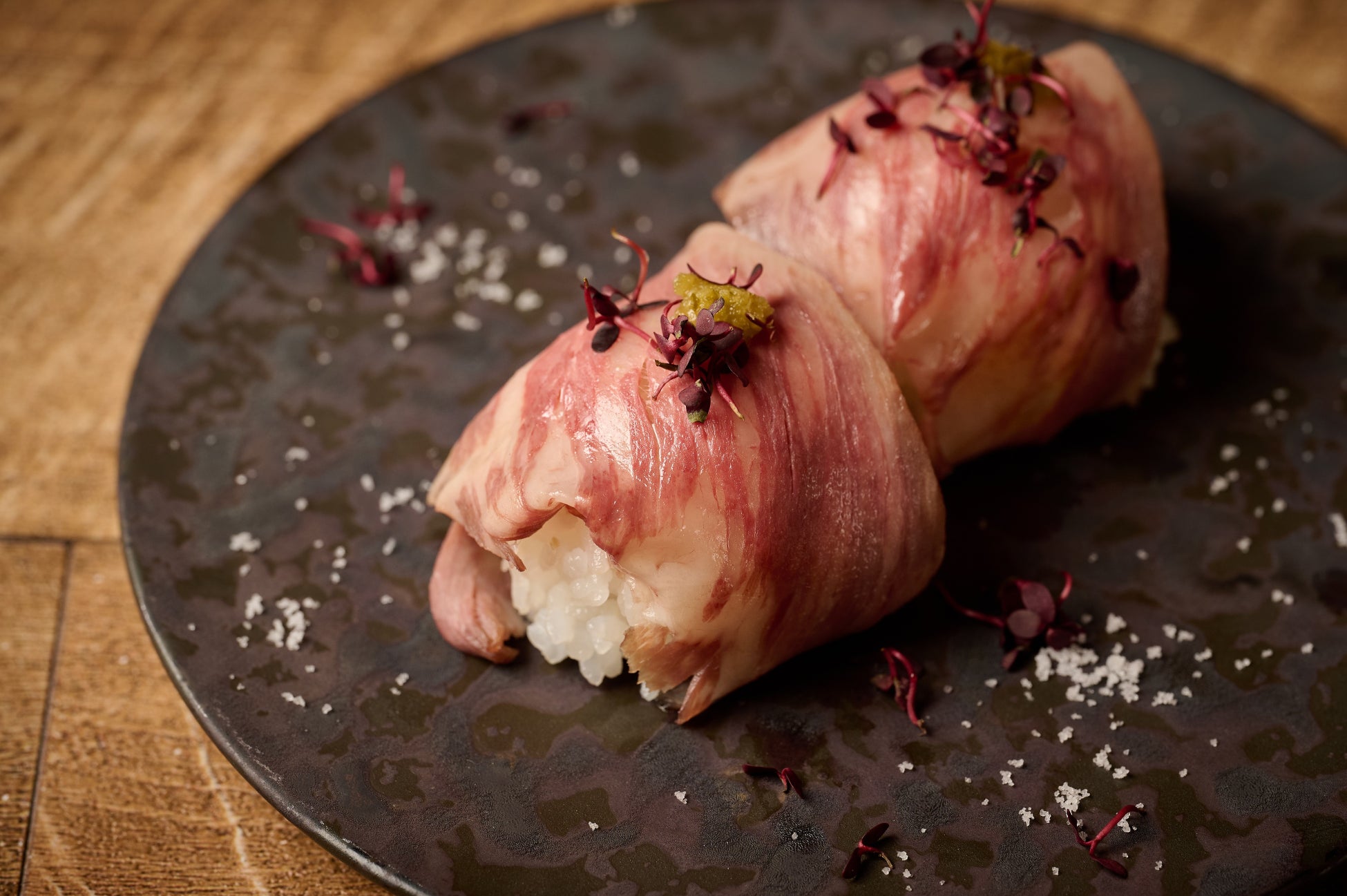 肉質は柔らかく、適度な霜降りと凝縮された旨味が特徴の熊本味彩牛の肉寿司。口の中でとろける食感をお楽しみください。