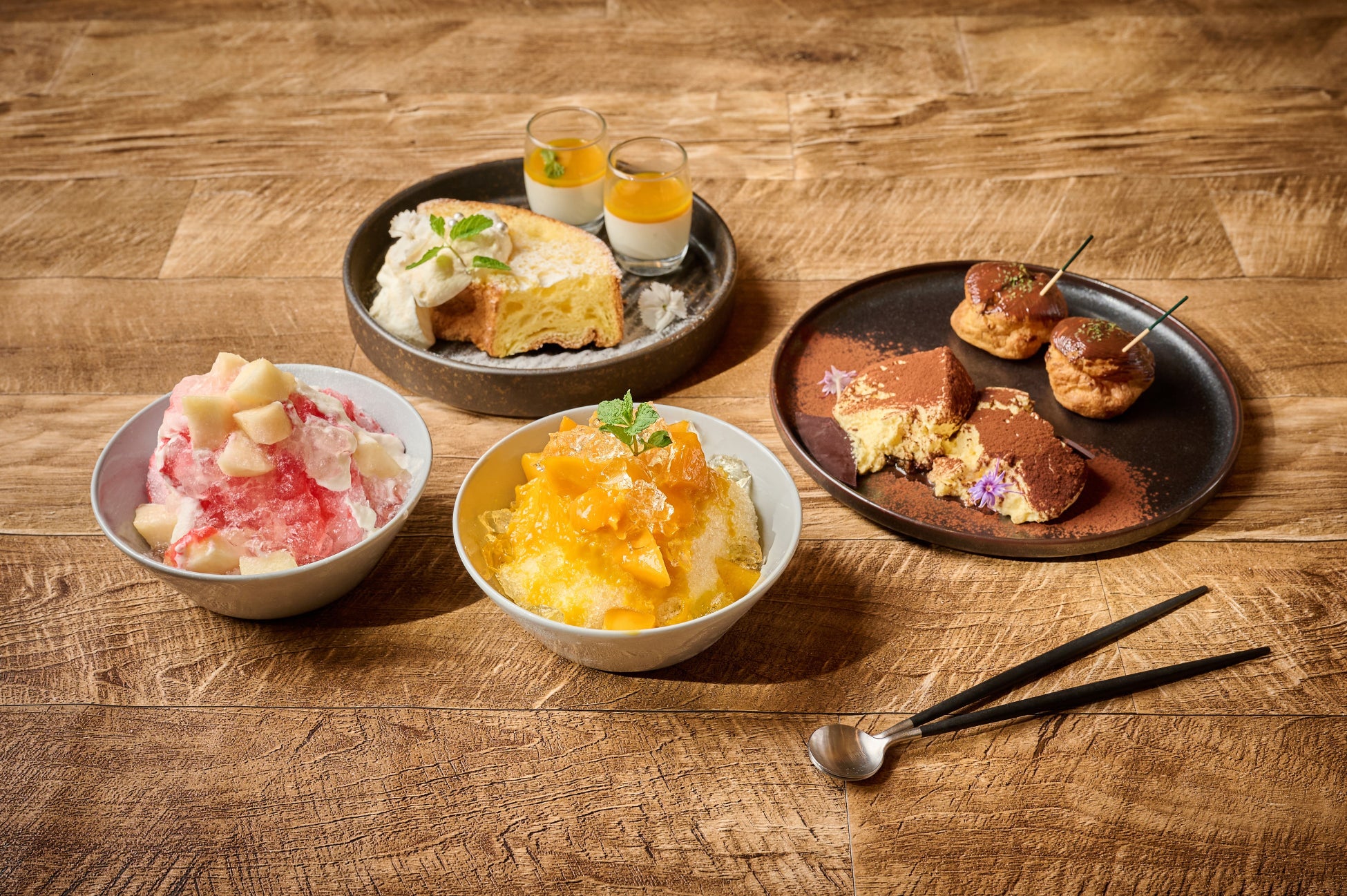 パティシエ厳選のデザートブッフェをご用意いたしました。夏祭りの屋台を思わせるたこ焼きをモチーフにした「シュー・ア・ラ・クレーム」や、カフェタイムにて人気メニューのシフォンケーキとティラミスも1日限り食べ放題でご提供いたします。暑い夏にぴったりなトロピカルなフルーツ、マンゴーや桃を使ったかき氷もご用意いたしました。