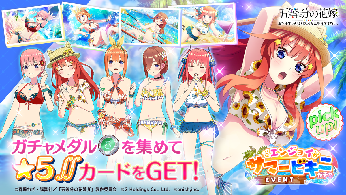 株式会社enish(本社:東京都港区、代表取締役社長:安徳 孝平、以下enish)は、2022年7月1日(金)より、アニメ「五等分の花嫁」初となるゲームアプリ『五等分の花嫁 五つ子ちゃんはパズルを五等分できない。』にて、週刊少年マガジン編集部完全監修のゲームオリジナルストーリーをフルボイスでお楽しみいただける新イベント「五つ子ちゃんとサマービキニ ~夏だ!海だ!サメ映画だ!!~」を開催いたします。本イベントの特典として、五つ子のビキニ姿を描き下ろしたイラストのオリジナルQUOカードを抽選でプレゼントいたします。