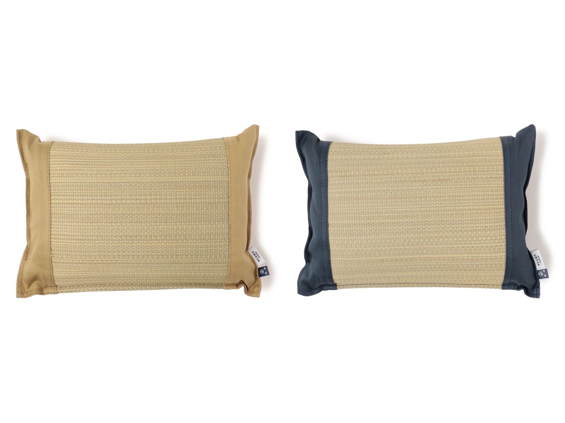 小さな織り目で仕上げた柔軟性のある“い草”の枕。中身には柔らかい樹脂製のパイプを使用し、程よい弾力性が特徴です。枕の中身のパイプは、中空の形状のため通気性が良く清潔に保ちます。両サイドの縁生地には、“い草”のカラーが引き立つ上品なネイビーと“い草”に馴染むナチュラルなベージュを配し、右下には〈BEAMS JAPAN〉のタグを配置したスペシャルデザインです。