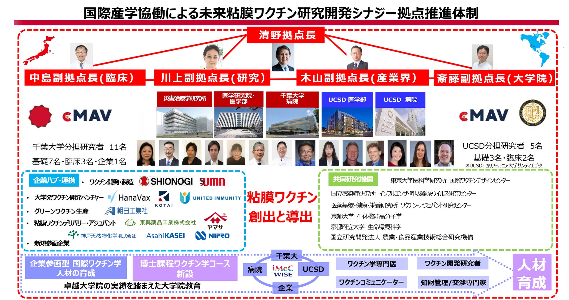 本学は、本事業の拠点として「未来粘膜ワクチン研究開発シナジー拠点」(拠点長:清野 宏 卓越教授)を形成し、全身免疫に加えて、従来の注射型ワクチンでは誘導が難しい粘膜免疫をともに惹起でき、感染阻止と重症化回避ができる粘膜ワクチン(経鼻や経口等)の開発等を推進します。- 千葉⼤学 未来粘膜ワクチン研究開発シナジー拠点 概要