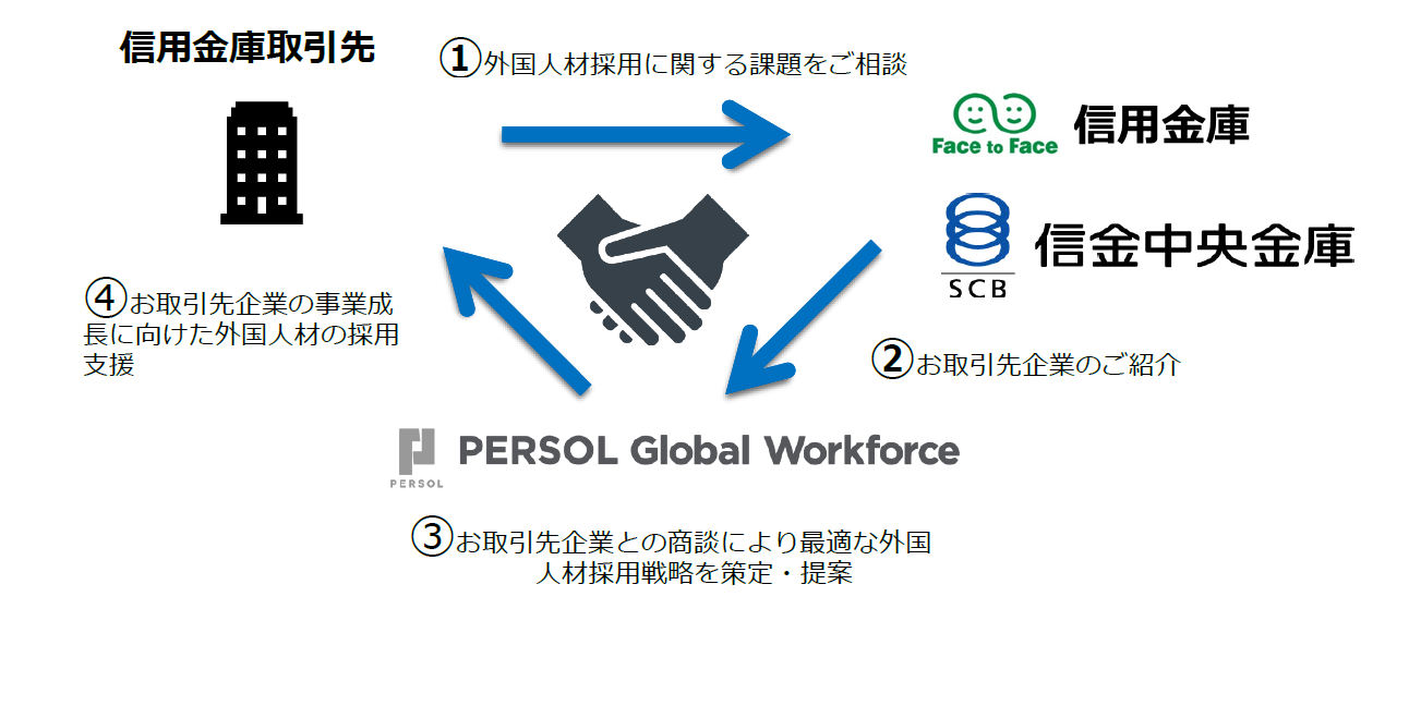 本業務提携は、PERSOL Global Workforceの外国人材に関する各種サービスを、信用金庫取引先をはじめとする中小企業が抱える課題に合わせて提供するものです。中小企業の即戦力として活躍できる、ミドル層の人材(一定のスキル・語学力をもつ在留資格「特定技能」人材)および総合職レベルの人材(技術エンジニア、ITエンジニア、文系職種など、在留資格「技術人文国際」人材)を対象に、企業の外国人材の募集・育成から就業・受け入れまでの過程を一貫してサポートしてまいります。
