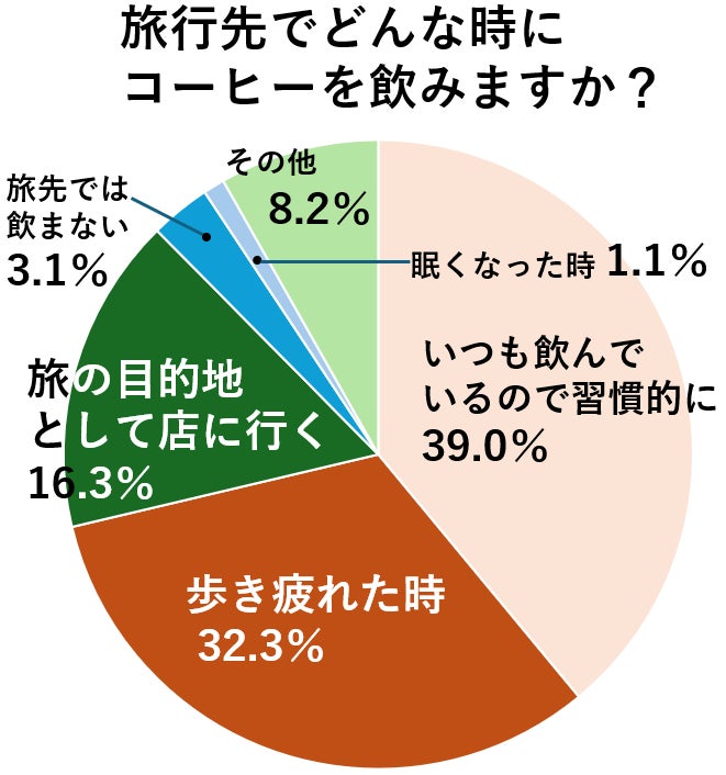 旅行中のどんな時にコーヒーを飲むのかを聞いたところ、一番多かったのが「いつも飲んでいるため習慣的に」(39%)でした。歩き疲れたから店舗で休憩がてらコーヒーを、という人は32.3%、旅の目的地として喫茶店やカフェを訪れるという人も16.3%いました。