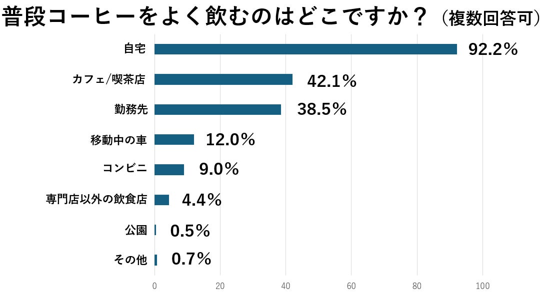 コーヒーをよく飲む場所については、やはり自宅で飲む人は多く92.2%。他の場所では、カフェや喫茶店が42.1%、勤務先が38.5%といった回答が多く、テイクアウトして公園で飲む、といった人は0.5%と案外少なく、屋内でコーヒーを楽しんでいる人が多い傾向でした。