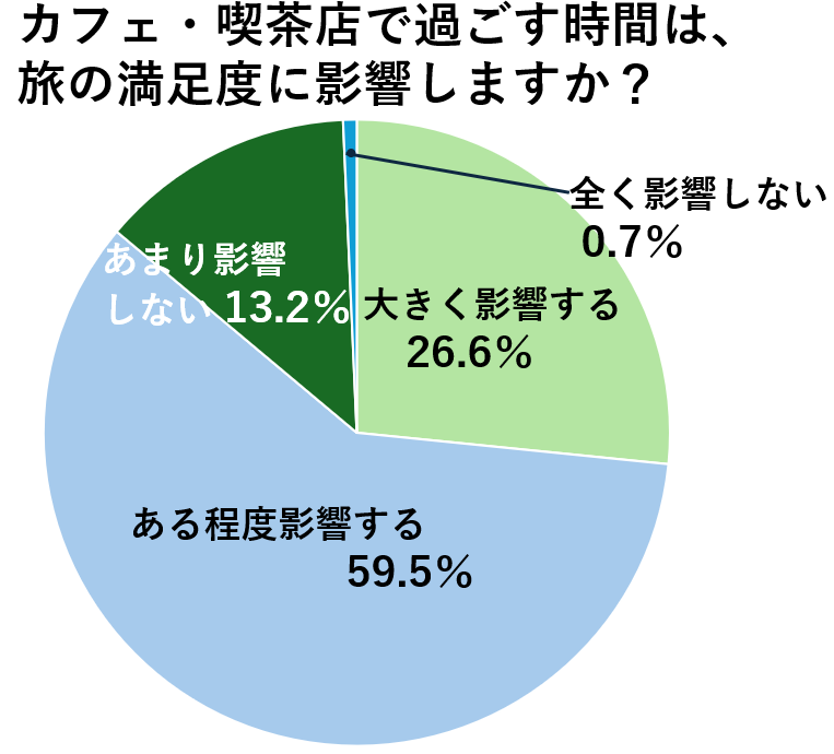 多くの人が旅先でのコーヒーを楽しんでいることが分かりましたが、カフェや喫茶店で過ごす時間が旅の満足度に影響するかどうかも聞いてみました。有効回答のうち大きく影響すると考える人は26.6%、ある程度は影響すると考える人は59.5%でした。合わせて86.1%の人が旅行先での癒やしのコーヒータイムが旅の満足度を向上させる要素だと認識していることが分かりました。