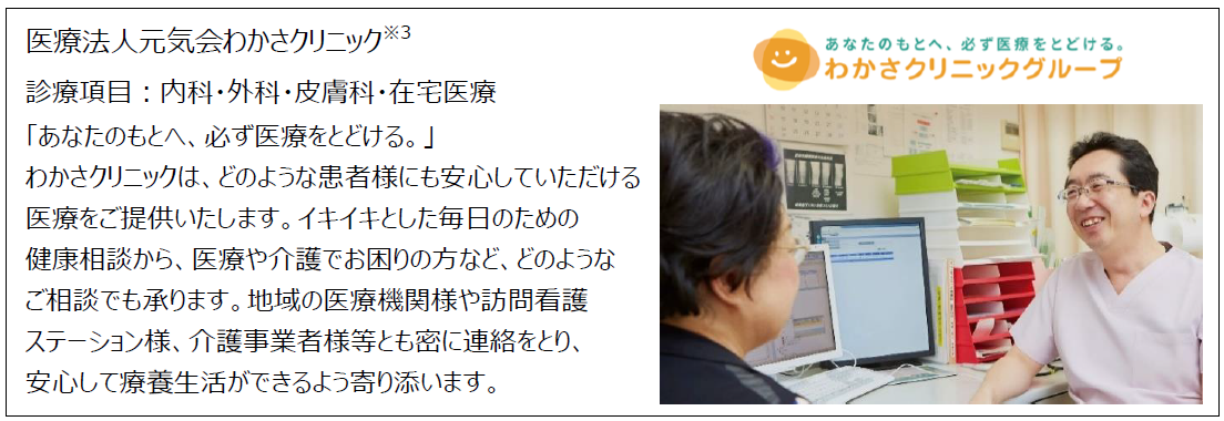 ※3 首都圏近郊に19拠点を展開し(2024年4月に「わかさクリニック津田沼」を開院)、埼玉・東京・千葉の各地で、患者様・利用者様の視点に立って地域に密着した外来医療と在宅医療、介護サービスの総合クリニックを提供。