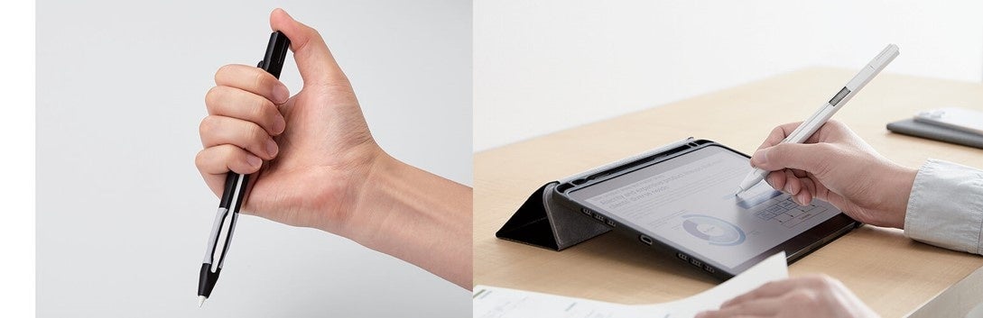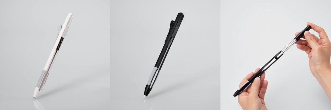 握る部分にはラバーグリップを採用しており、すべりにくく握りやすいデザインです。さらに、携帯に便利なクリップが付いており、カバンやiPad本体ケースのポケットなどに差し込むことで落下や紛失のリスクを軽減します。