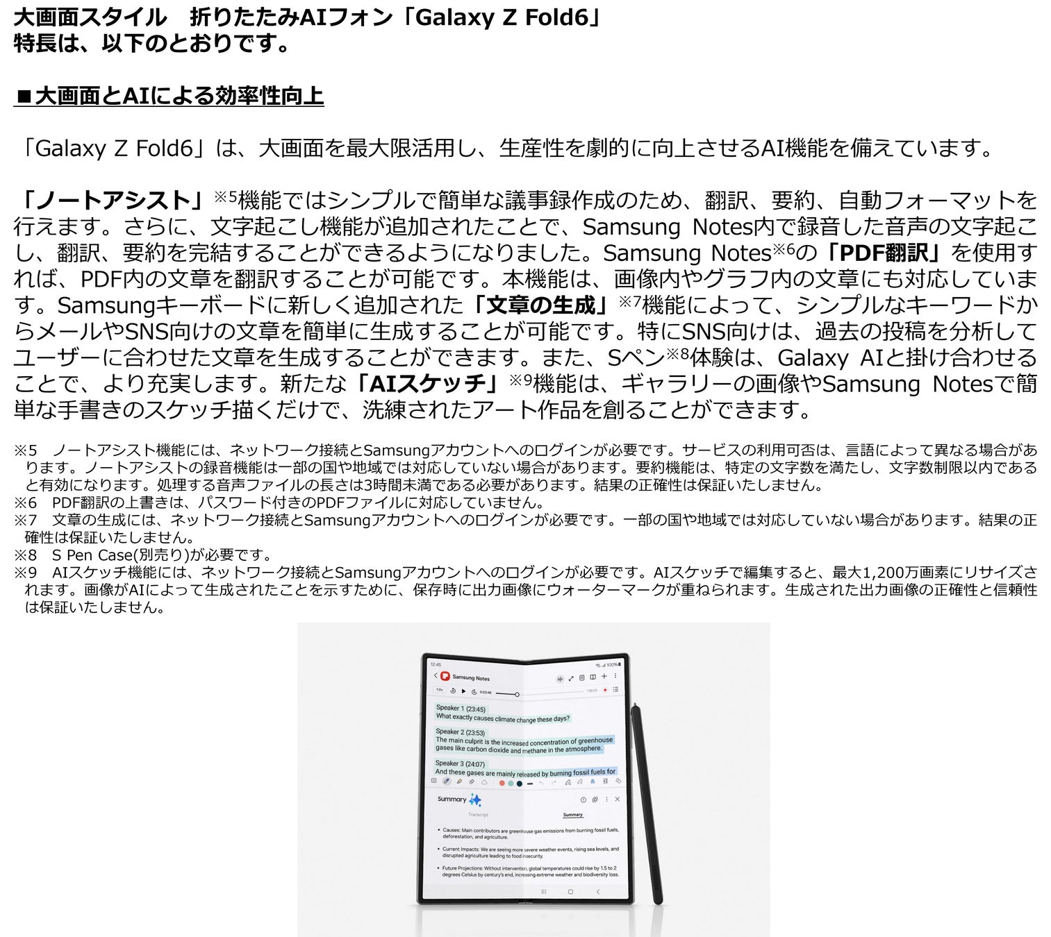 ※1 一部のGalaxy AIの機能の使用には、Samsungアカウントへのログインが必要な場合があります。当社はAI機能によって提供されるものに対し、正確性、完全性および信頼性について、いかなる保証もいたしません。国や地域、OS/One UIバージョン、デバイスのモデル、キャリアによって使用できるGalaxy AI機能は異なります。一部の機種では、対応する機能が制限される場合があります。Galaxy AIの機能は、一部の国や地域ではAI使用に関する年齢制限のため、未成年は利用が制限される場合があります。Galaxy AIは対応するGalaxyデバイスで2025年末まで無料で提供される機能です。 第三者が提供するAI機能には、異なる条件を適用する可能性があります。