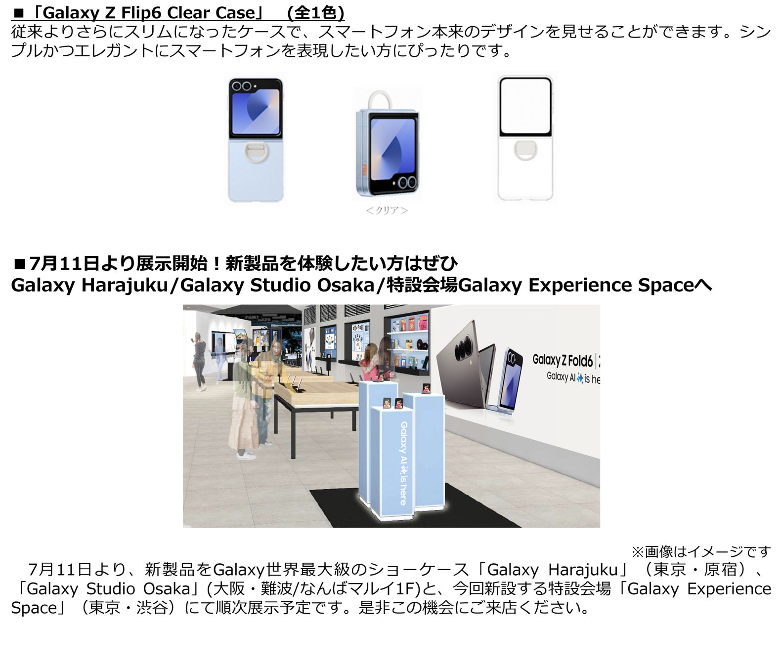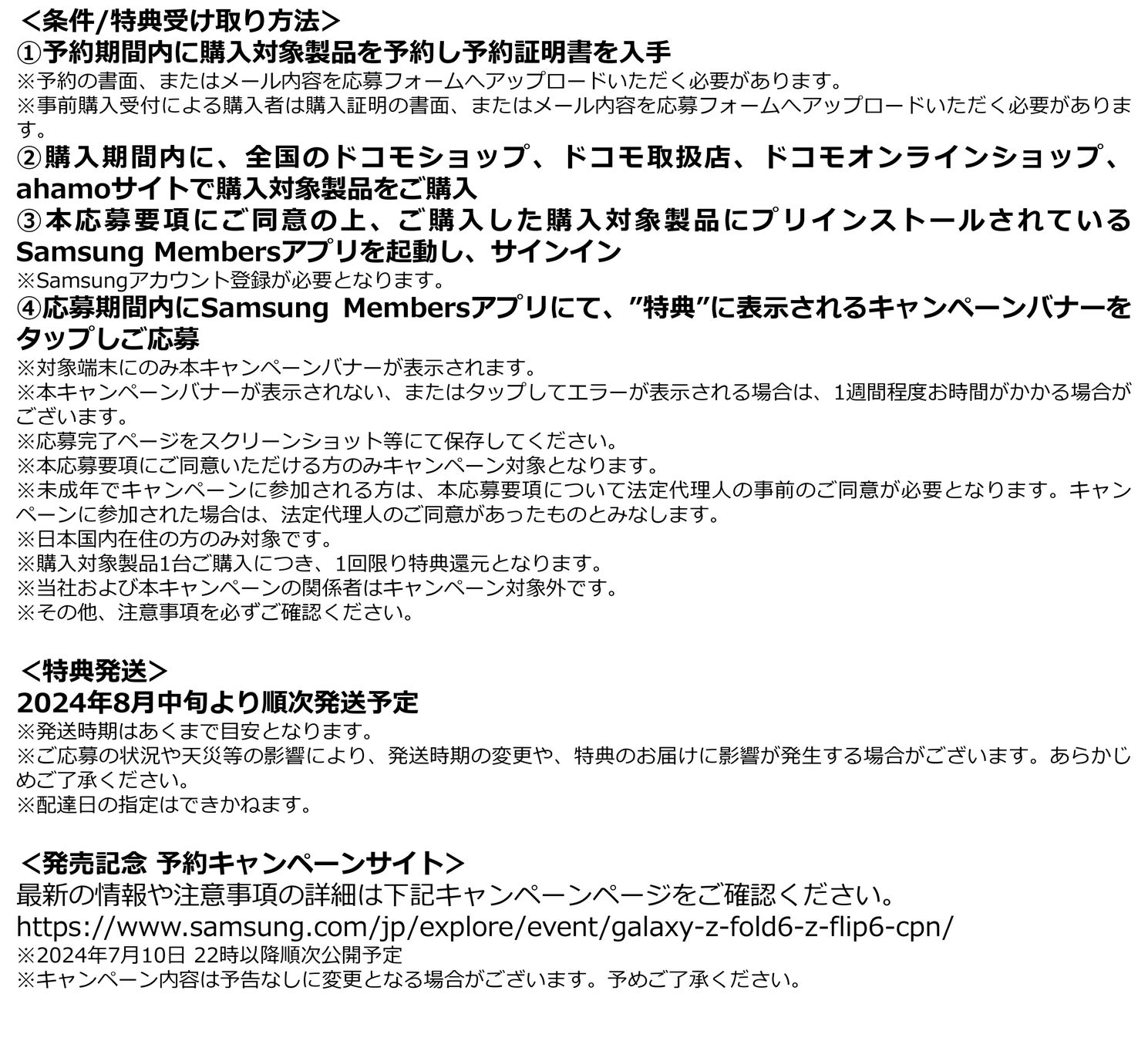 「Galaxy Z Fold6」「Galaxy Z Flip6」は2024年7月17日(水)より予約受付を開始し、2024年7月下旬より販売を開始。「Galaxy Z Fold6」「Galaxy Z Flip6」の純正・専用アクセサリーは、2024年7月下旬以降より販売を開始いたします。これらの製品は全国のドコモショップ、ドコモ取扱店、ドコモオンラインショップ、ahamoサイトおよび世界最大級のショーケース「Galaxy Harajuku」(東京・原宿)「Galaxy Studio Osaka」(大阪・なんば)、「Galaxy Experience Space」(SHIBUYA TSUTAYA 1F)にて取り扱いいたします。