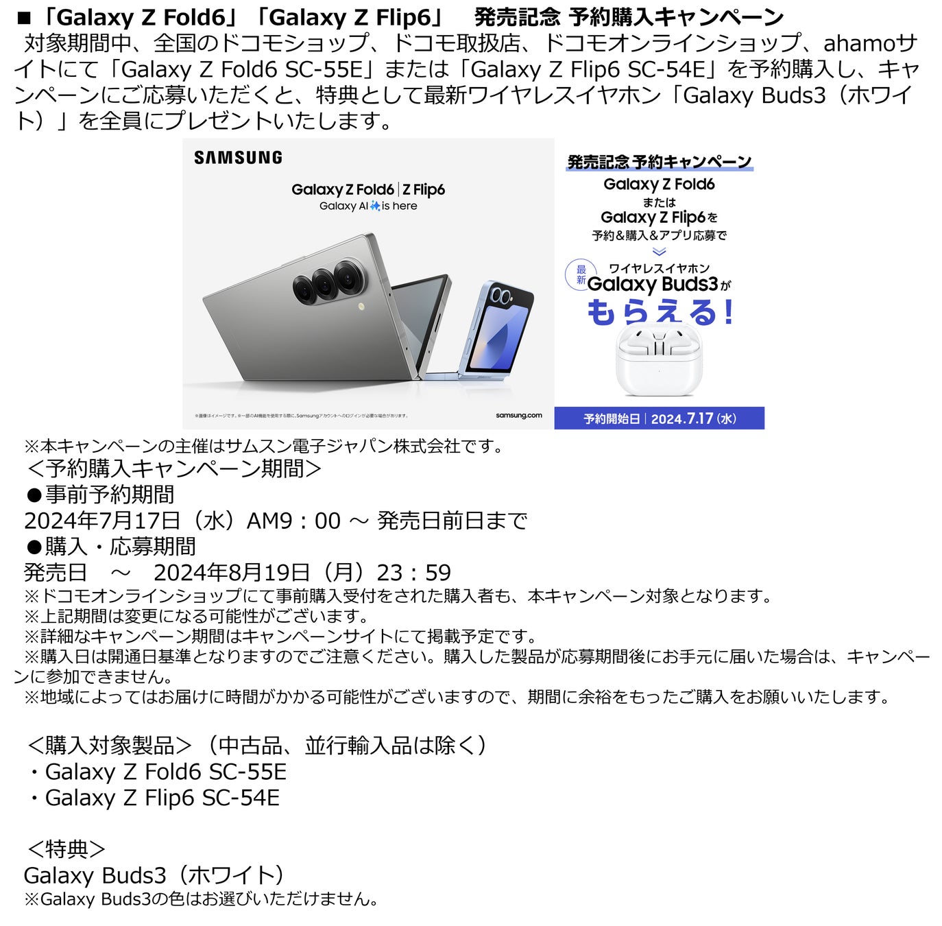 また、2024年7月17日(水)から対象期間中に「Galaxy Z Fold6」「Galaxy Z Flip6」を予約、購入しキャンペーンにご応募いただいたお客様に、本日発表の最新ワイヤレスイヤホン「Galaxy Buds3」をプレゼントする「発売記念 予約キャンペーン」※を開催いたします。