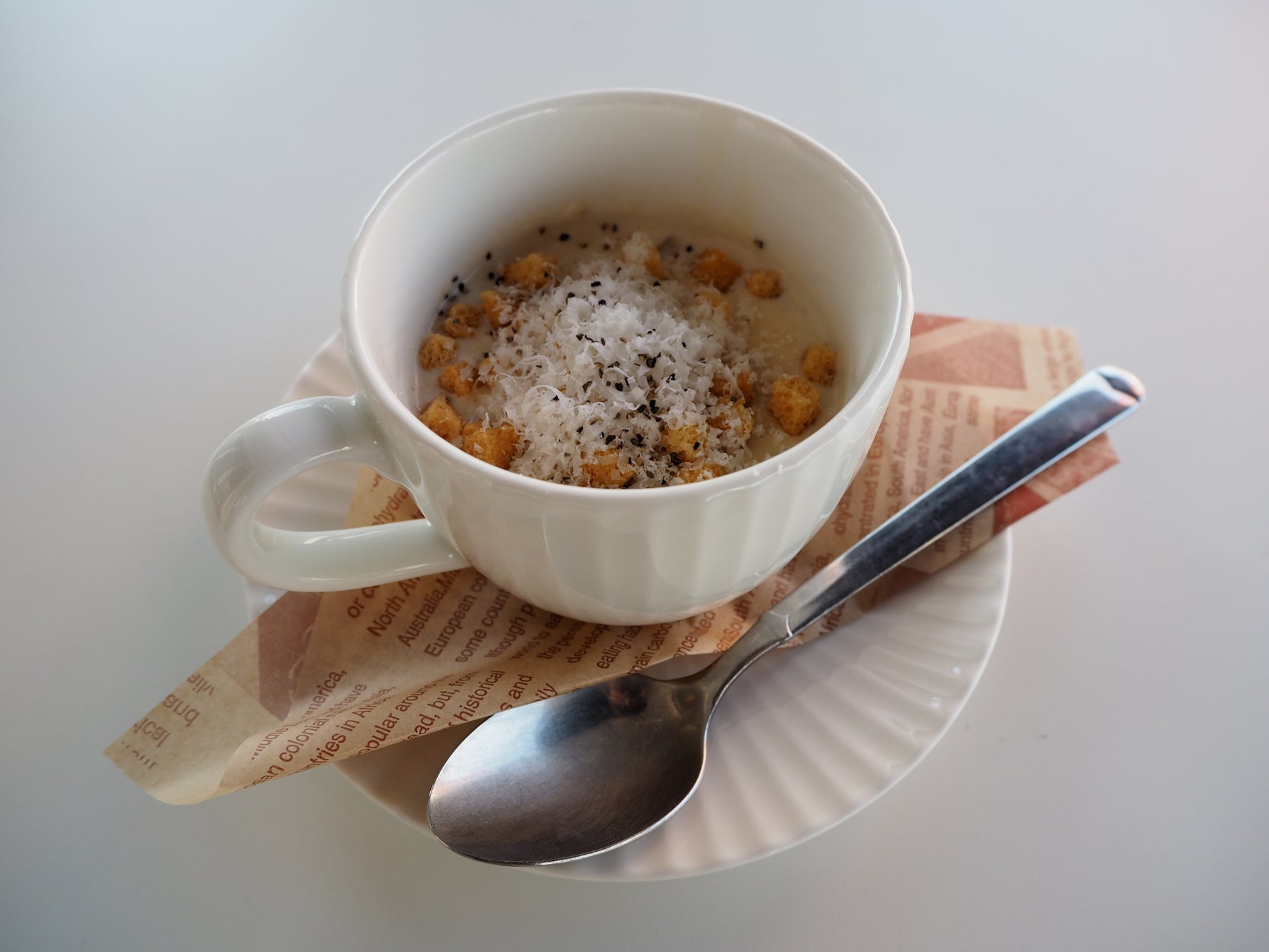 濃厚で旨味たっぷりのクラムチャウダーに、香ばしいクルトンを加え、仕上げに削りたてのチーズをふわりと。とろみとコクが広がる、冬にぴったりのあたたかい一杯。