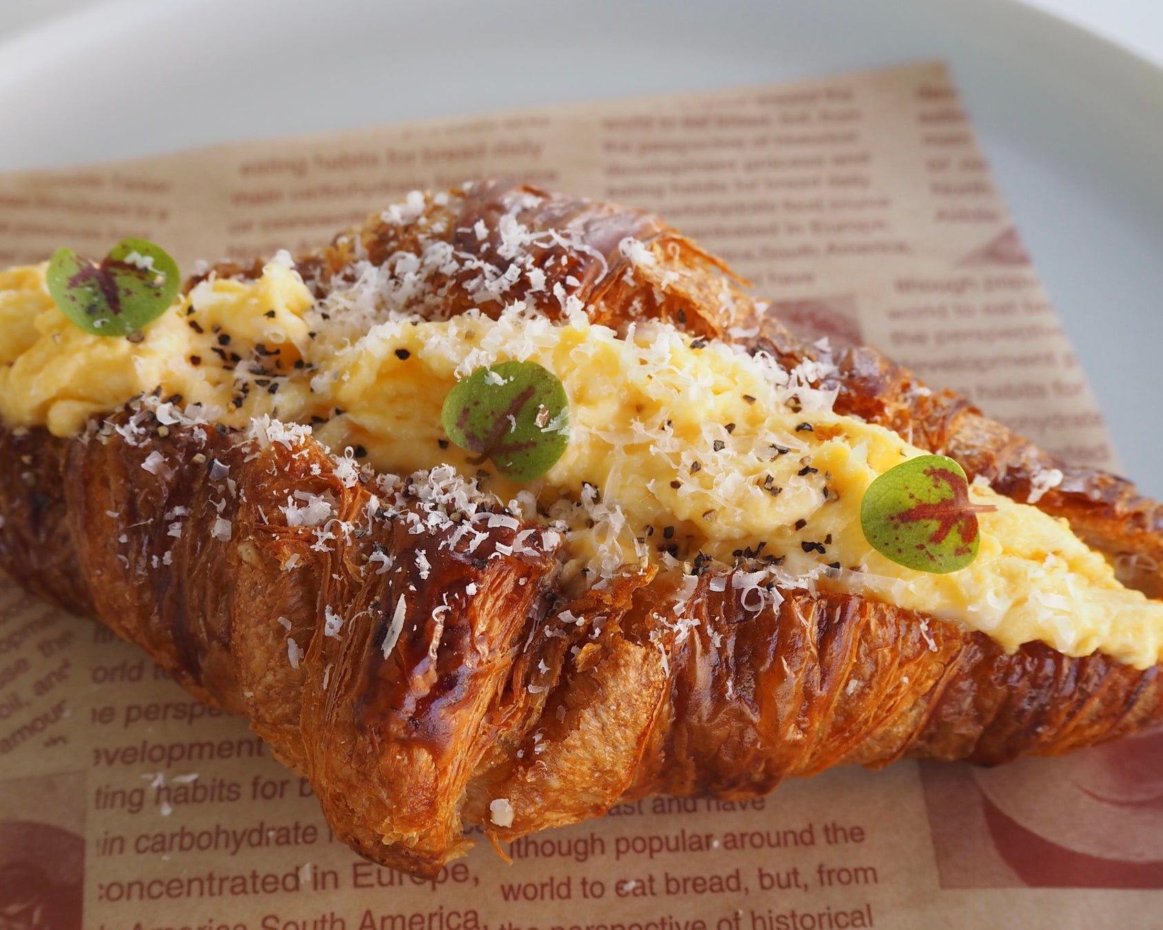 香ばしいクロワッサンに、ふわふわのオムレツをサンド。仕上げにふわっととろけるチーズをたっぷり削りました。