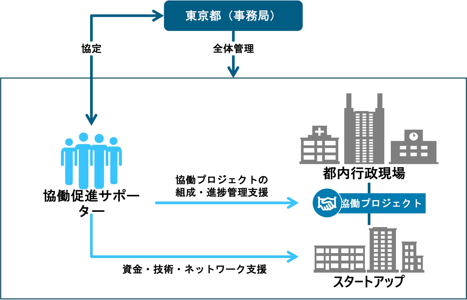 協働促進サポーターは、自身のリソースやノウハウ、ネットワークを活用しながら、都や事務局と連携して、スタートアップと都内行政現場との協働プロジェクトの組成・実施を支援するとともに、スタープアップの革新的な技術やサービスにより都内行政現場の課題解決を実現し、協働プロジェクトを実施したスタートアップがキングサーモン企業としての認定を受け、将来的に海外市場を席巻するようなスタートアップとして大きく成長を遂げられるようサポートを行ないます。