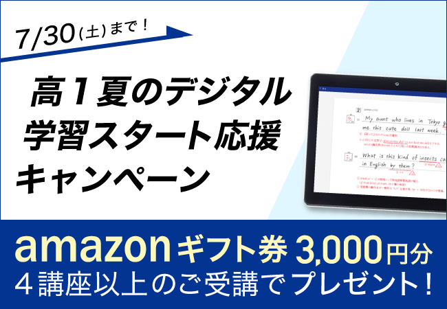 さらに、4講座以上を12カ月一括払いでお申し込みいただき、入会後、アンケートにご回答いただいた方には【Amazonギフト券3,000円分】をプレゼントする「高1夏のデジタル学習スタート応援キャンペーン」を実施中。