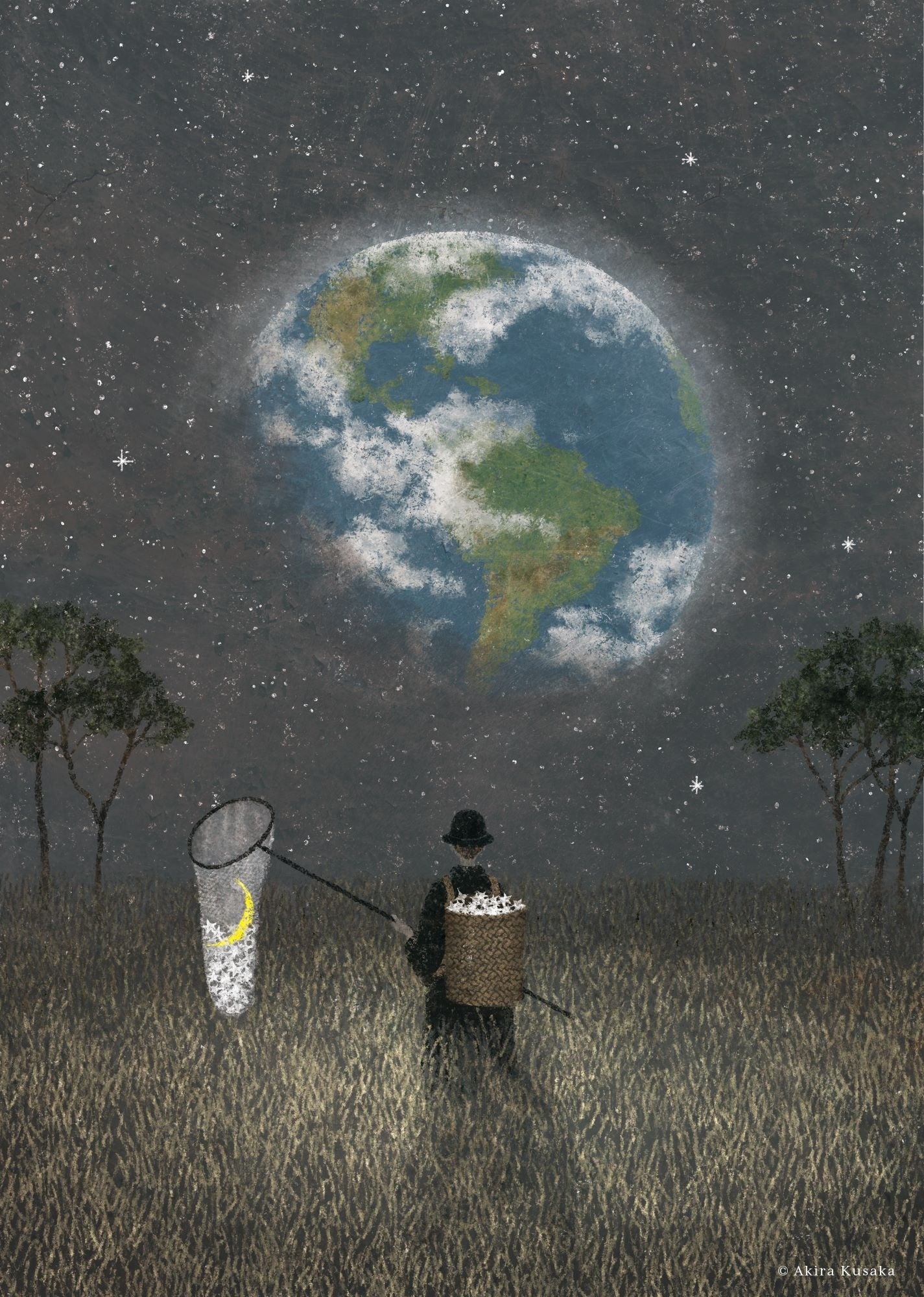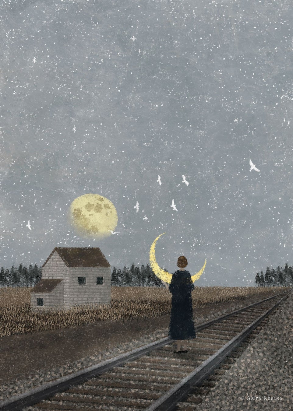 書籍の挿画やアーテイストのメインビジュアルまで幅広く活躍の場を広げている日下明。冷たくて暖かい、可愛らしくもどこか物悲しい、相反する要素が交じり合うことで複雑な感情を表現しています。落ち着いた色合いで描かれた作品には、幼いころから月を観察することが好きだったということもあり、全ての物語の始まりを表すモチーフとして月が多く登場します。